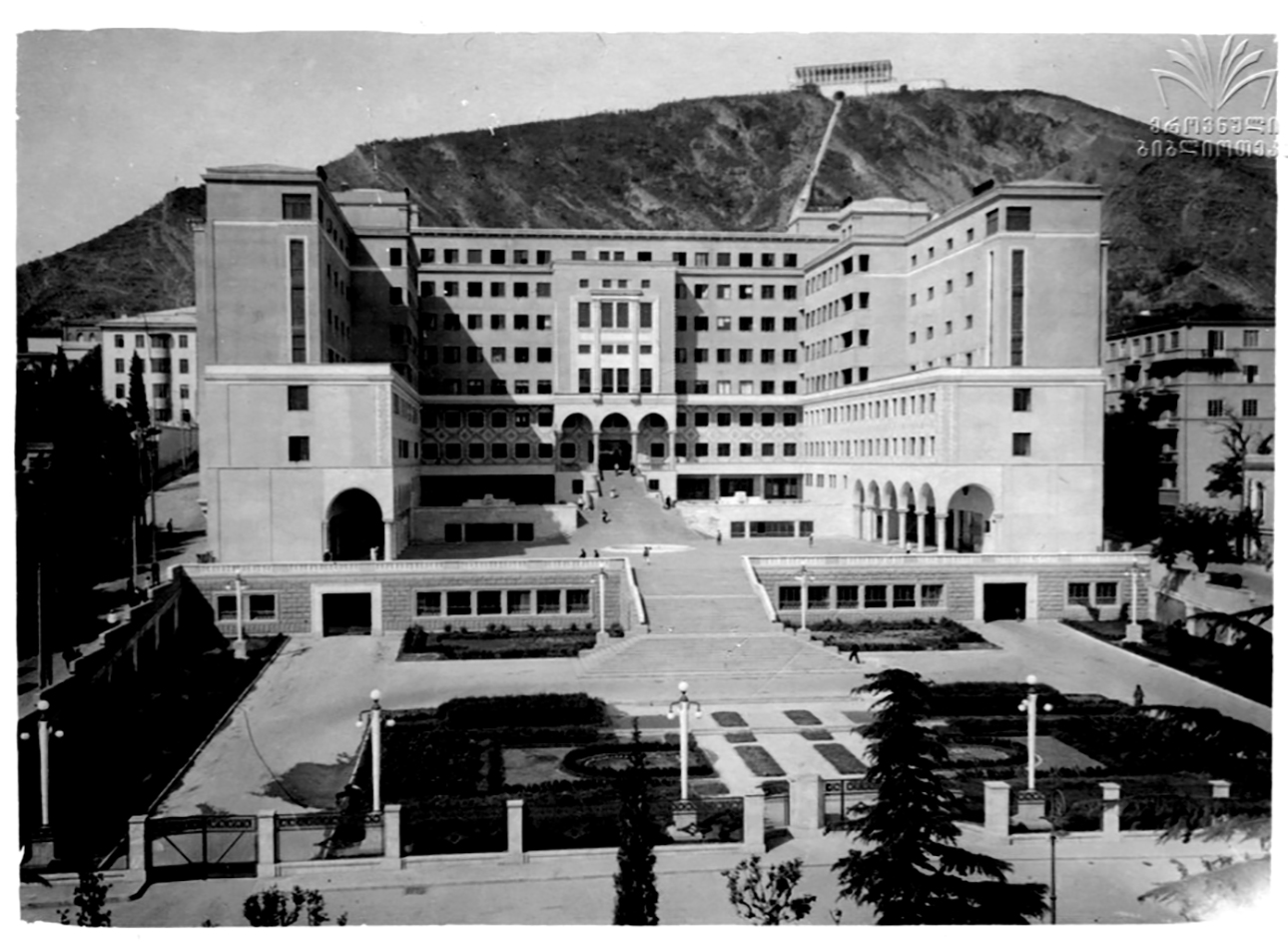 Vista aérea de la casa de gobierno y el edificio superior de la República Socialista Soviética en Georgia. Foto: sin datos de autoría, Biblioteca Nacional de Georgia.