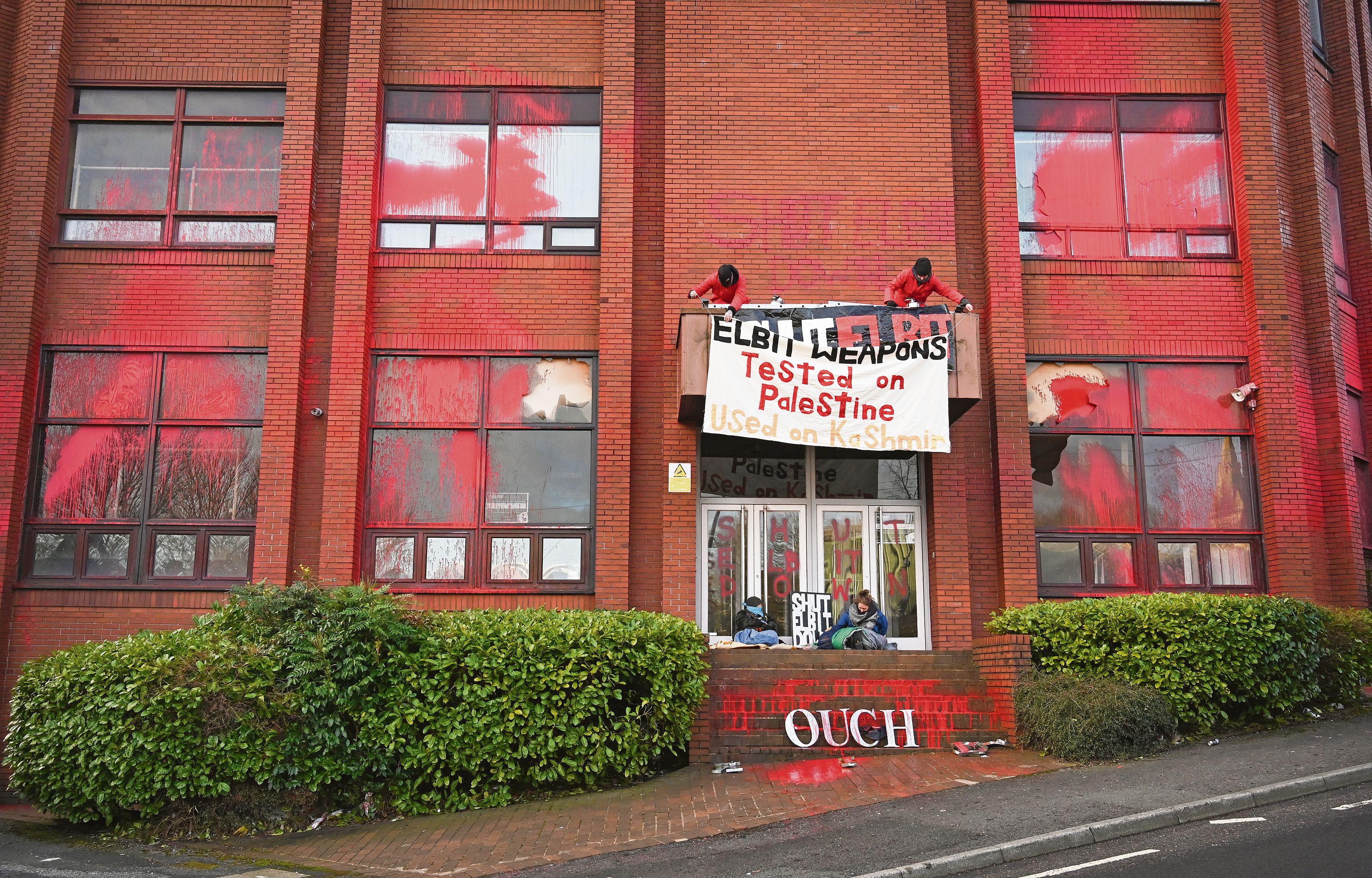 Activistas de Extinction Rebellion North y de Palestine Action en la fábrica Elbit Ferranti, en Waterhead, en el noroeste de Inglaterra, febrero de 2021.