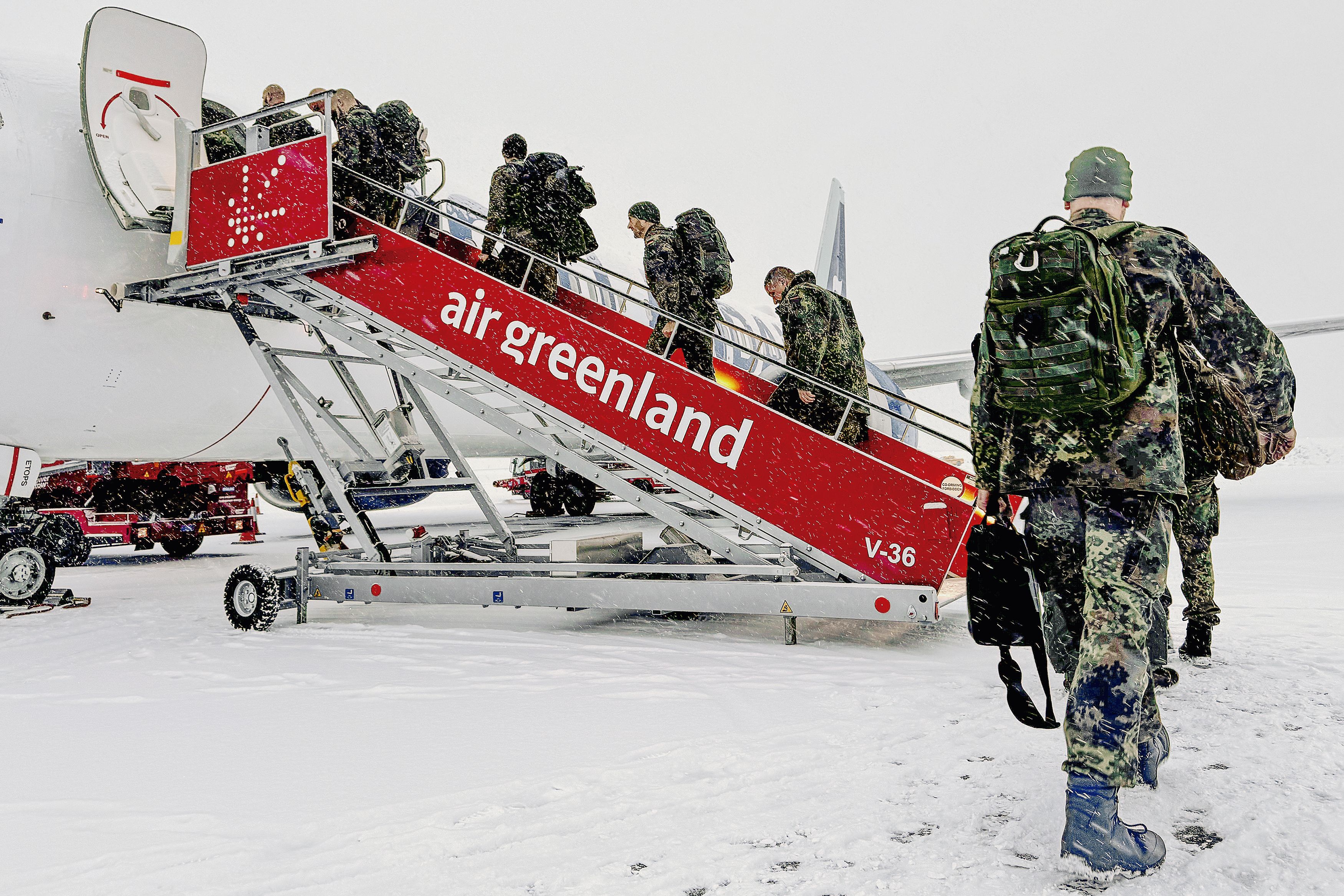 Militares alemanes en el aeropuerto de Nuuk, Groenlandia, abordan un vuelo con destino a Reikiavik, Islandia, el 18 de enero.