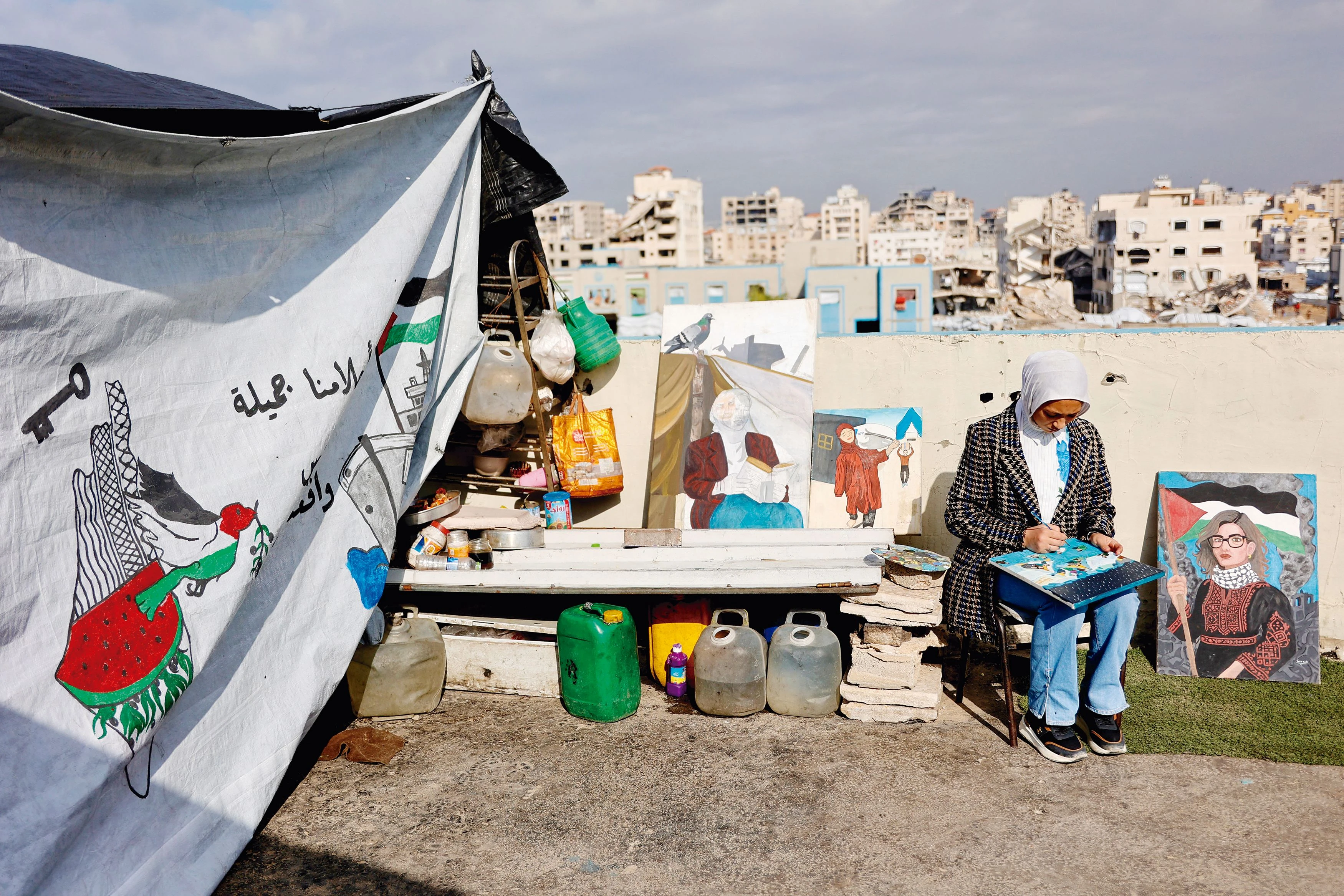 Sarah Saada, palestina desplazada, fuera de su tienda de campaña en Gaza, junto a un retrato que pintó de Francesca Albanese, el 30 de diciembre de 2025.