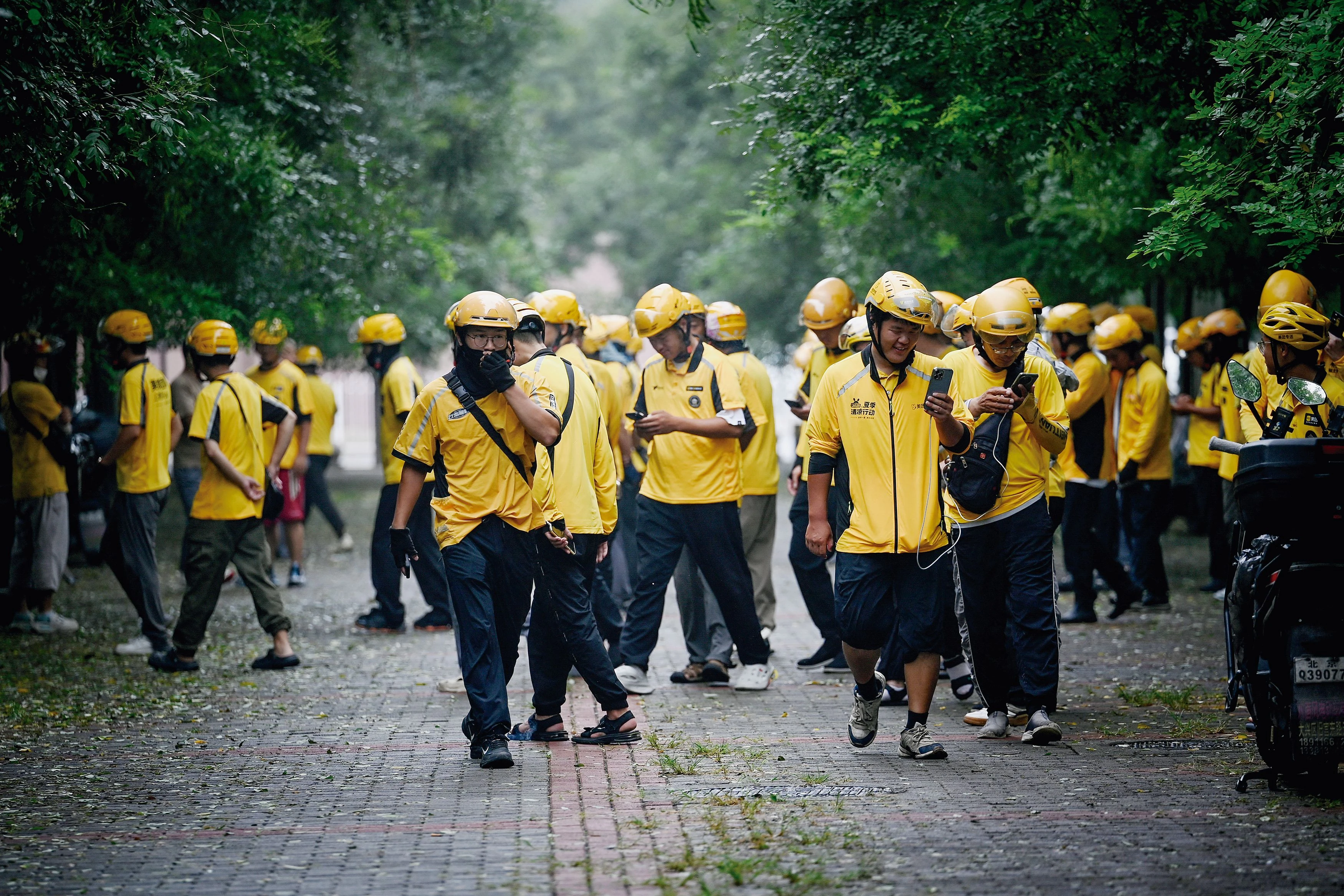 Repartidores de la plataforma de compras china Meituan antes de comenzar su turno cerca de un centro comercial en Pekín, el 21 de agosto de 2025.