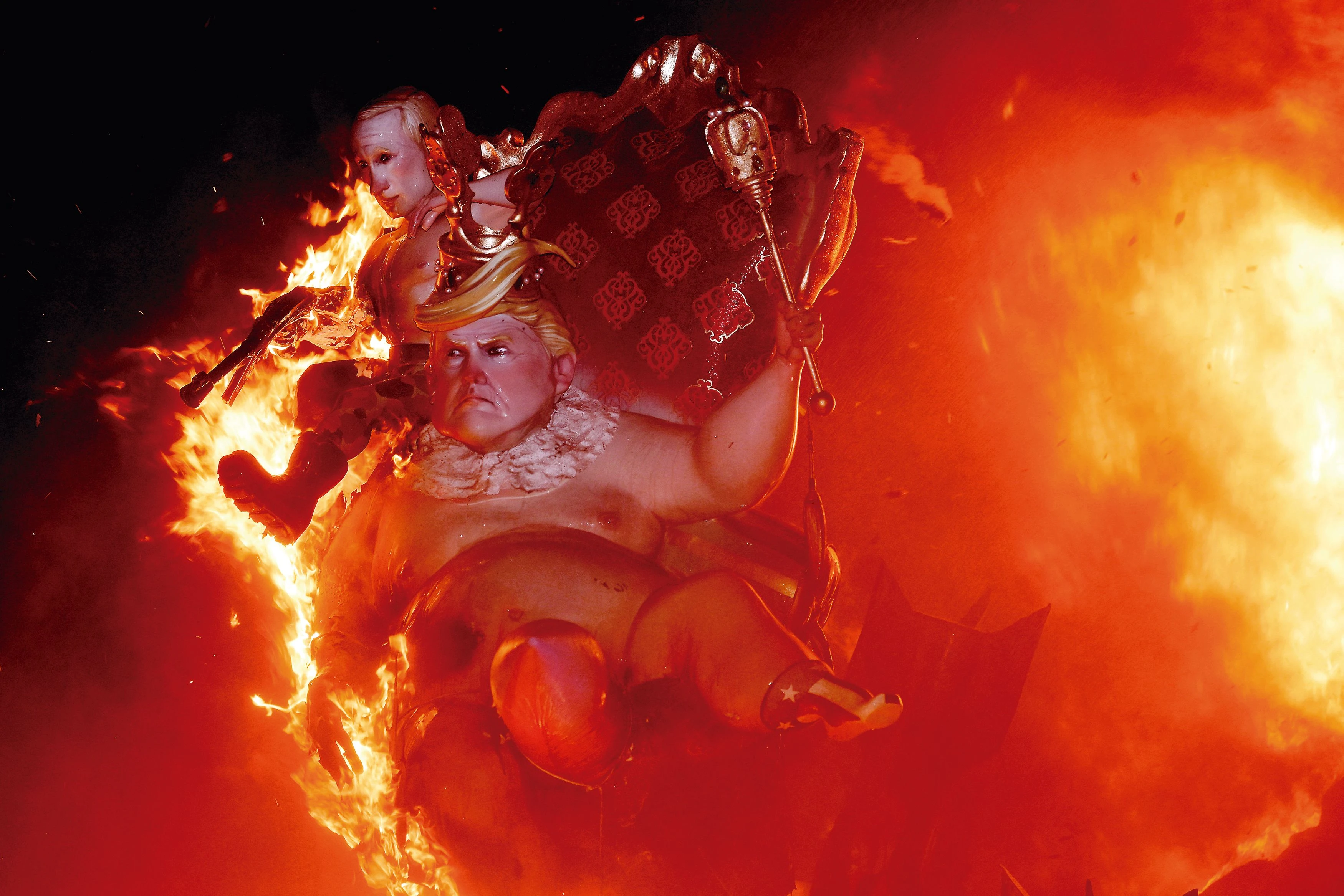 Los ninots ("muñecos" en valenciano) que representan al presidente estadounidense, Donald Trump, y al presidente ruso, Vladimir Putin, arden durante la "noche de la quema" en la última noche de las Fallas de Valencia, el 19 de marzo.