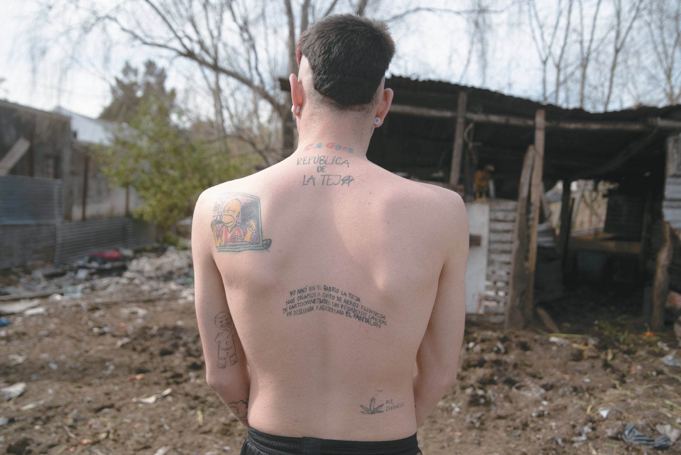 Tatuajes de Lale; en el medio, un poema escrito por él en homenaje al barrio.