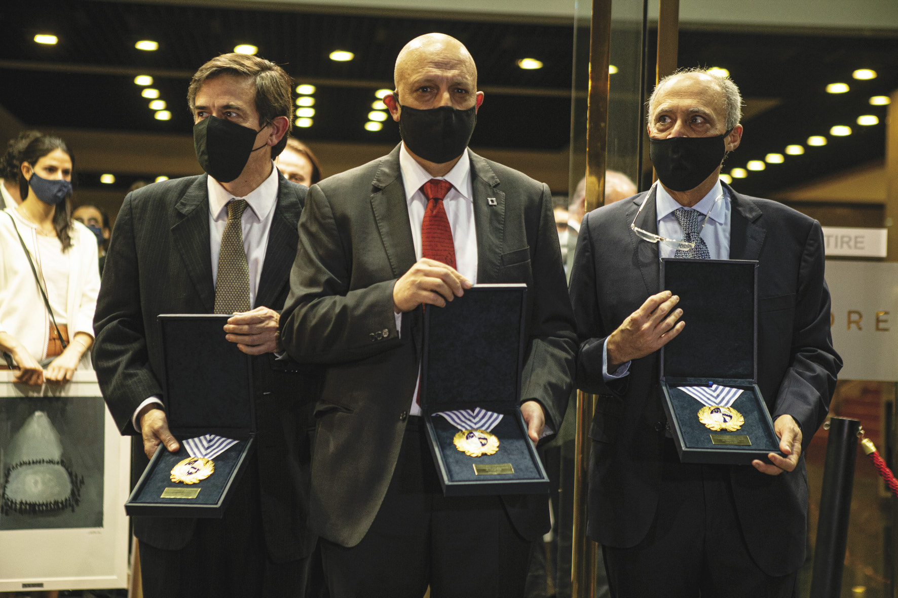 Fernando Paganini, Rafael Radi y Henry Cohen durante el homenaje al GACH, en el auditorio Adela Reta, el 8 de julio de 2021.
