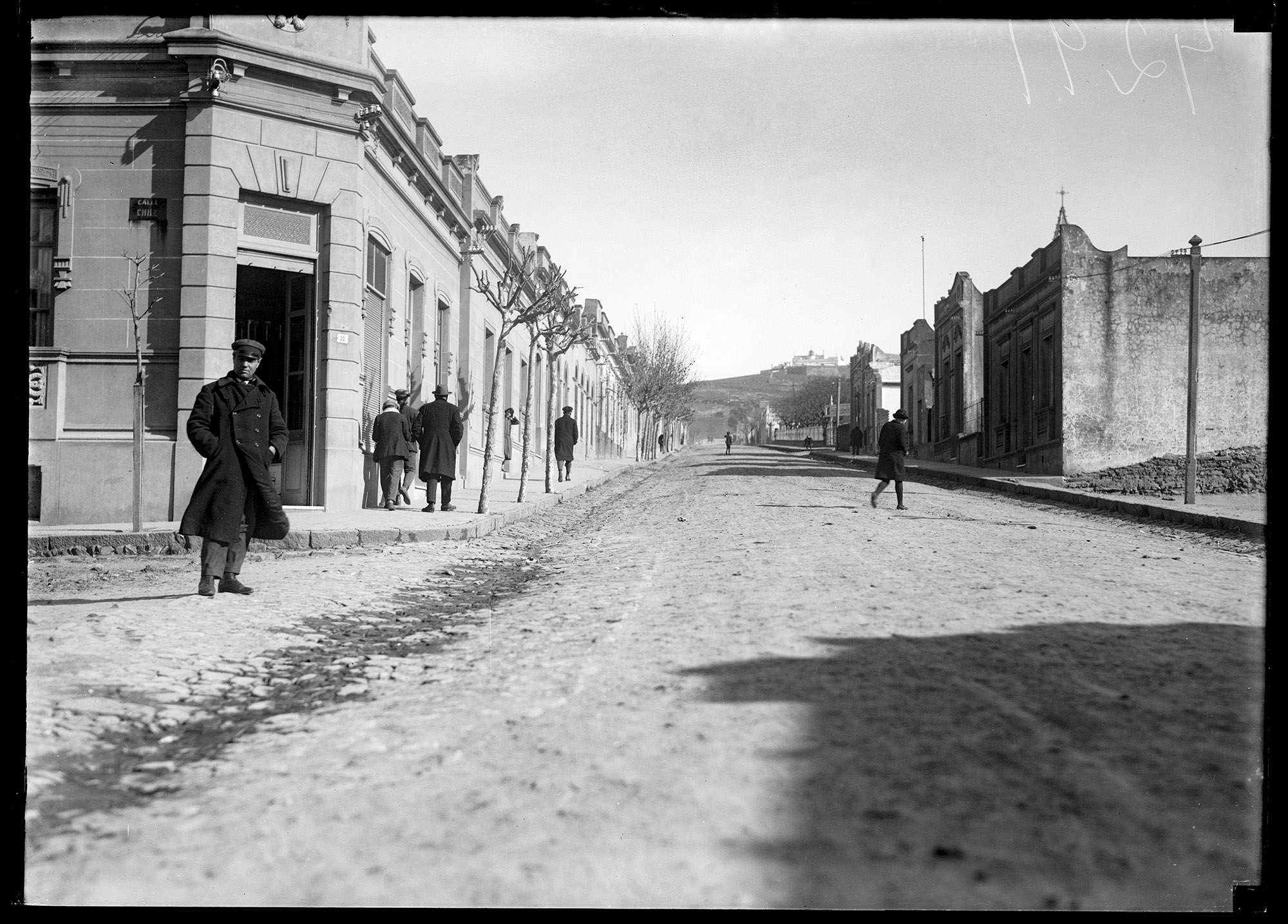 Esquina de las calles Juan B. Viacaba y Chile, antes de la pavimentación de la primera, 1926, soporte vidrio.