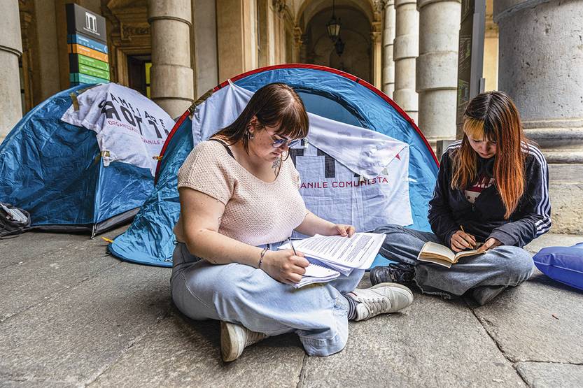 Campamento de estudiantes en el patio del Rectorado de la Universidad de Turín, el 15 de mayo.