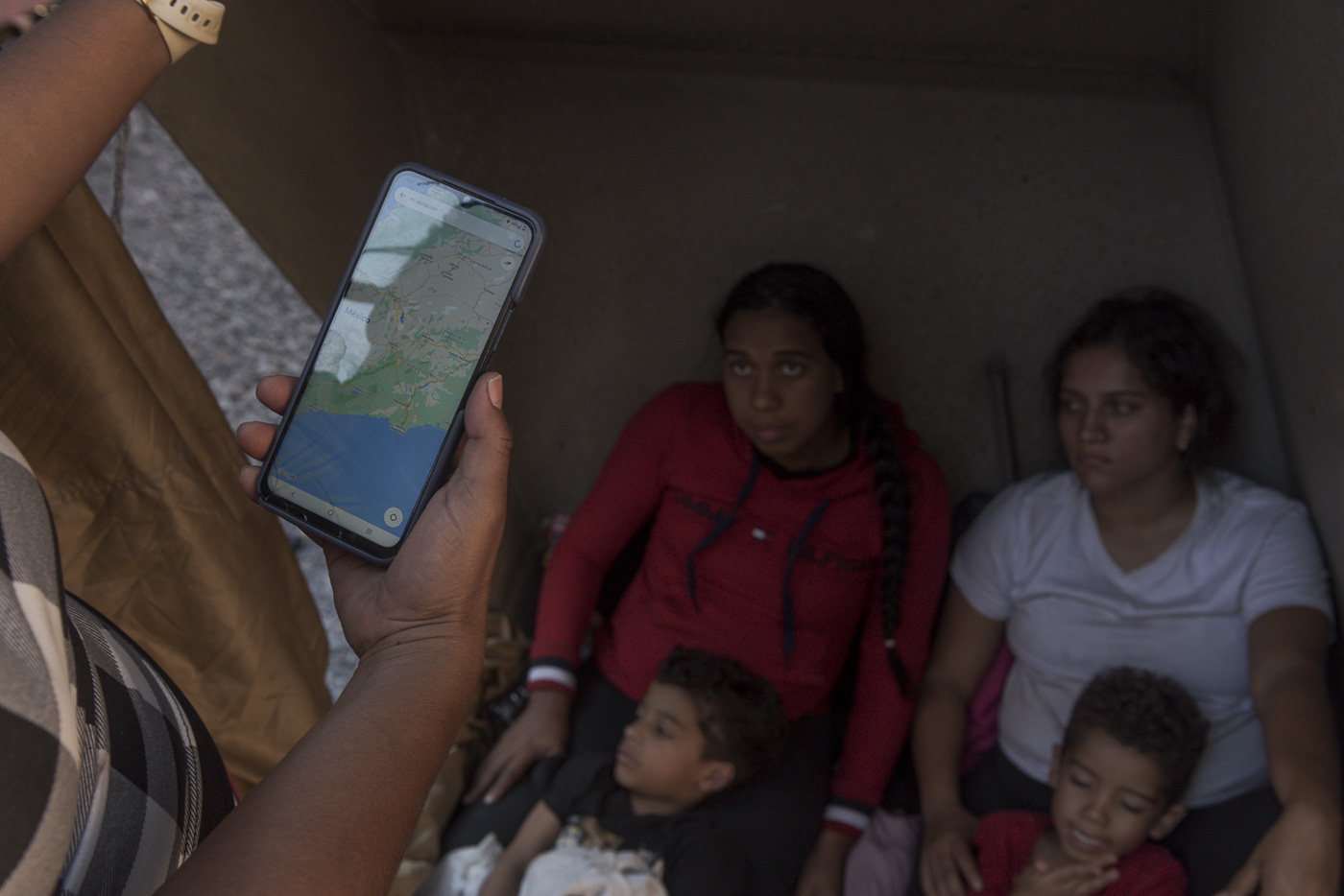 Janayka, Matías, Mauricio y Abraham a bordo del tren La Bestia, preguntando por su ubicación dentro de México en un mapa. Lugar desconocido, México, 19 de junio.