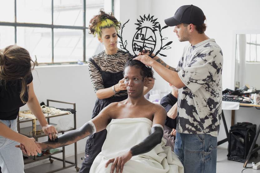 Gaia Marichal, Delfina Martínez y Brian Paván durante le preparación del Retrato N3, _Cultura del recorte_.