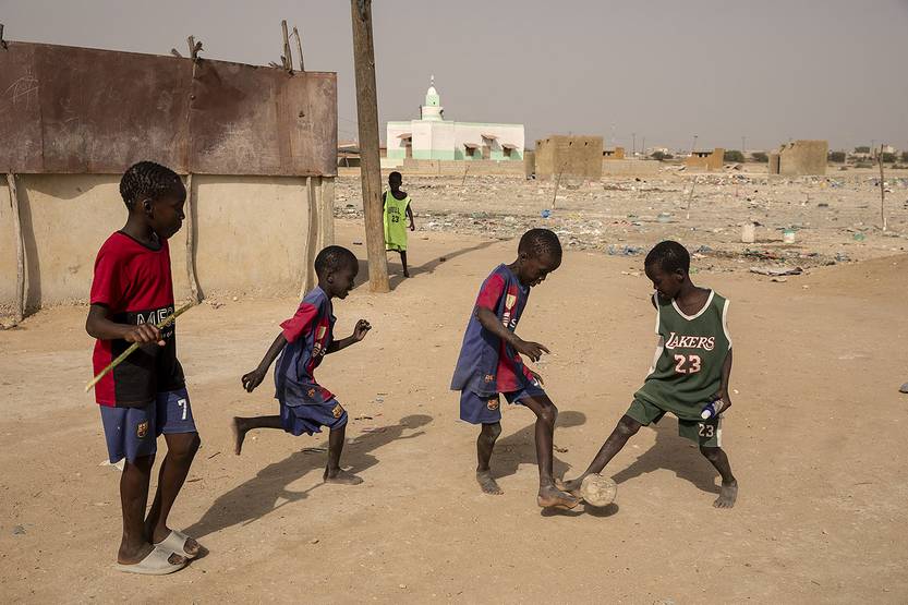 Niños del asentamiento temporal de Khar Yalla para desplazados internos que perdieron sus hogares debido a la erosión costera. El campamento de Khar Yalla es una mezcla de pequeñas casas de hormigón y carpas ubicadas en un campo vacío lejos del centro de la ciudad.