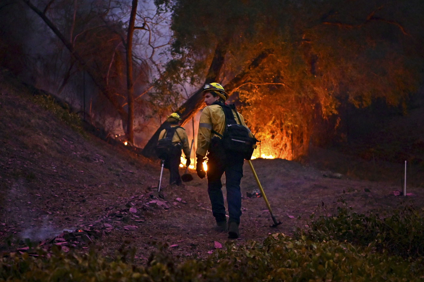 Bomberos trabajan en el barrio Mandeville Canyon, mientras el incendio de Pacific Palisades sigue ardiendo, el 11 de enero.