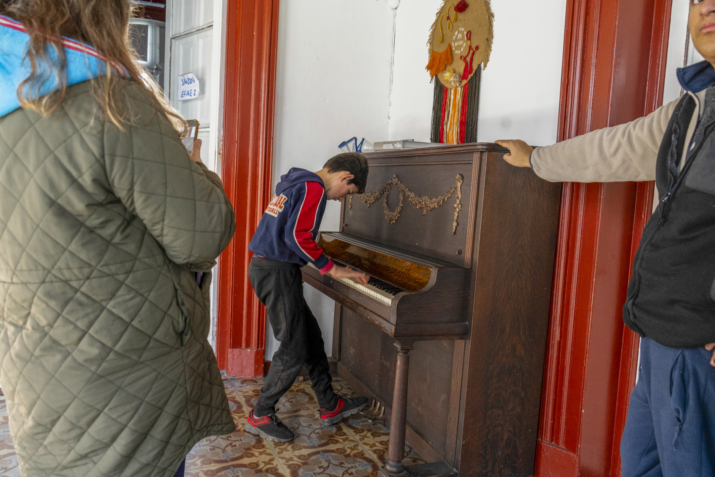 Kevin Olivera toca el piano para sus amigos.