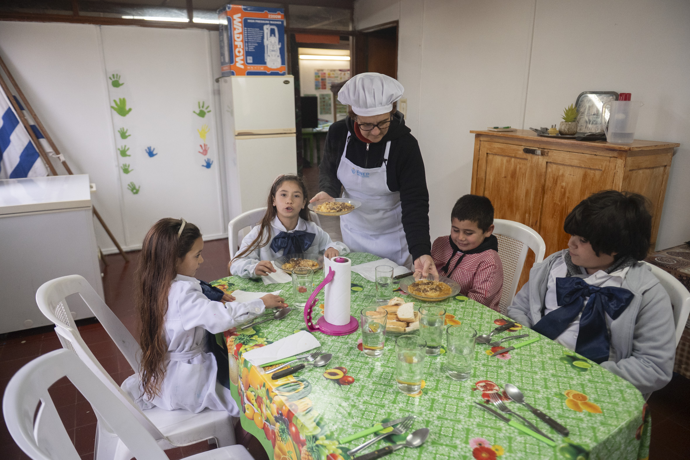 La cocinera María Rodríguez les sirve el almuerzo a Melina, Julieta, Juan José y Alan.
