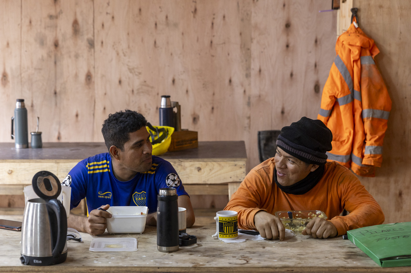 Sebastián Cienfuegos y Jim Chávez durante su hora de descanso en la obra ubicada en la esquina de Rincón y Zabala.
