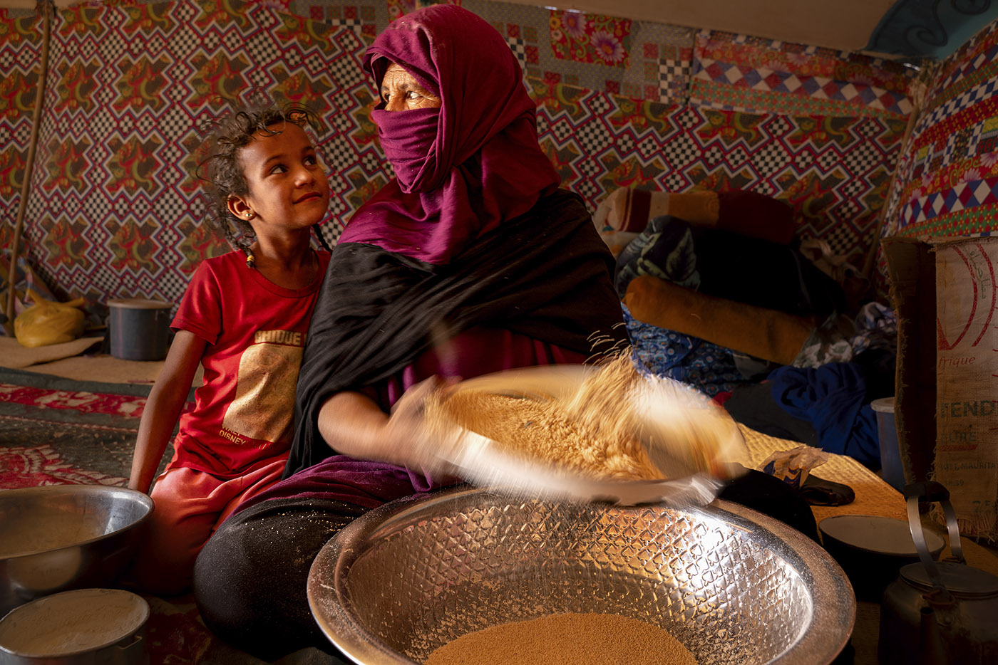 Fatma junto a su hija menor tamizando sémola de trigo para hacer cuscús.