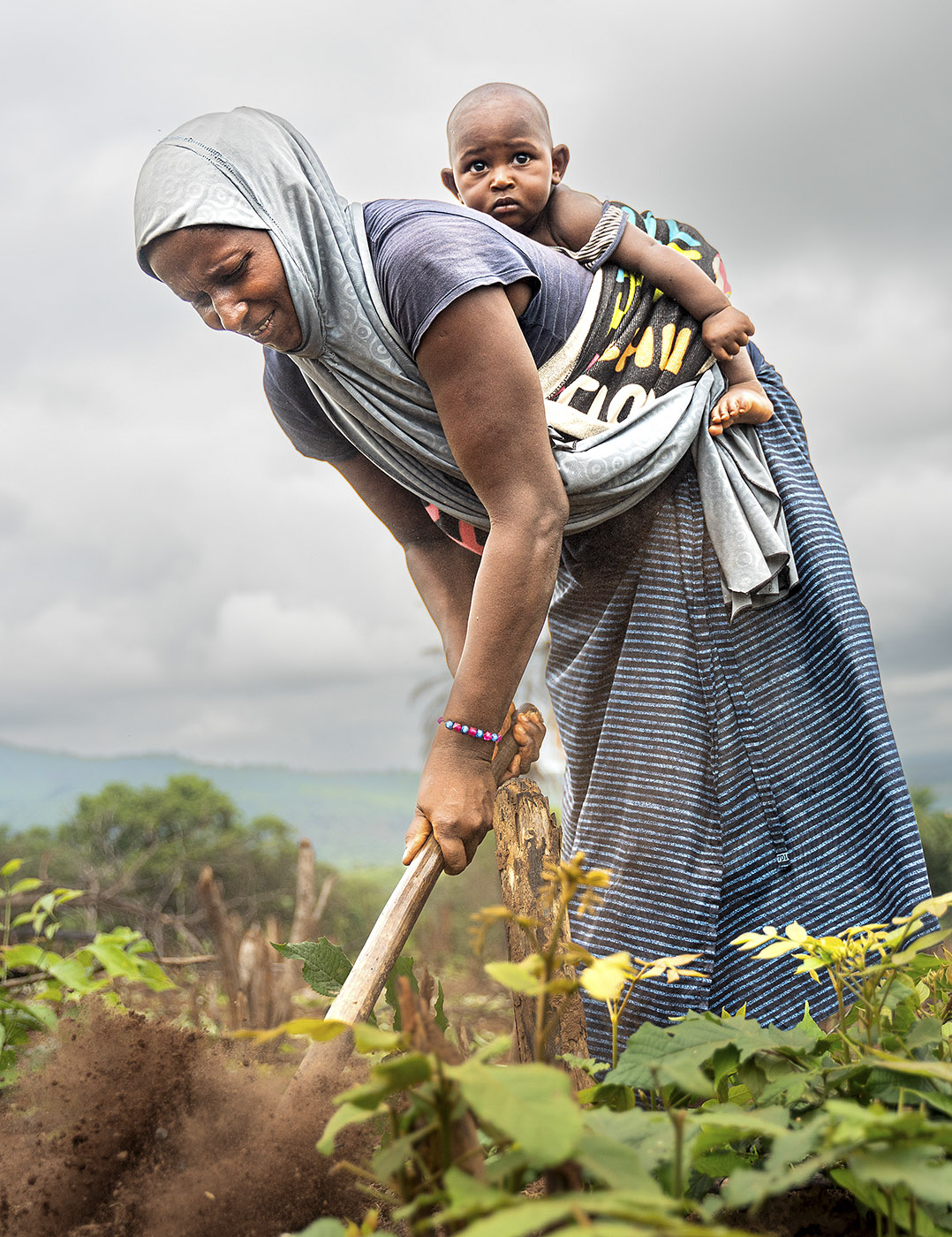 Aissatou con su hijo más pequeño en la huerta familiar.