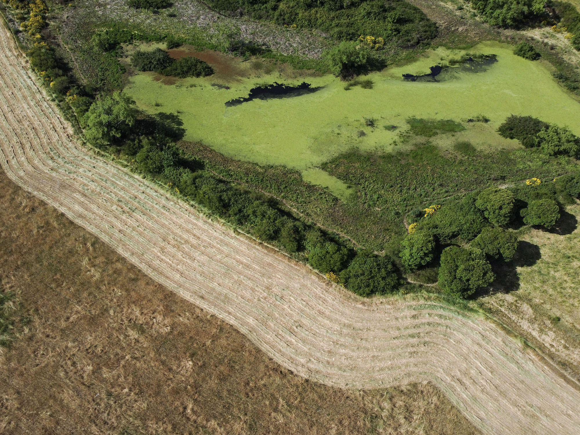 Vista aérea de plantaciones de maíz sobre un tajamar en la cuenca del arroyo Canelón Chico, el 11 de noviembre, en Canelones.