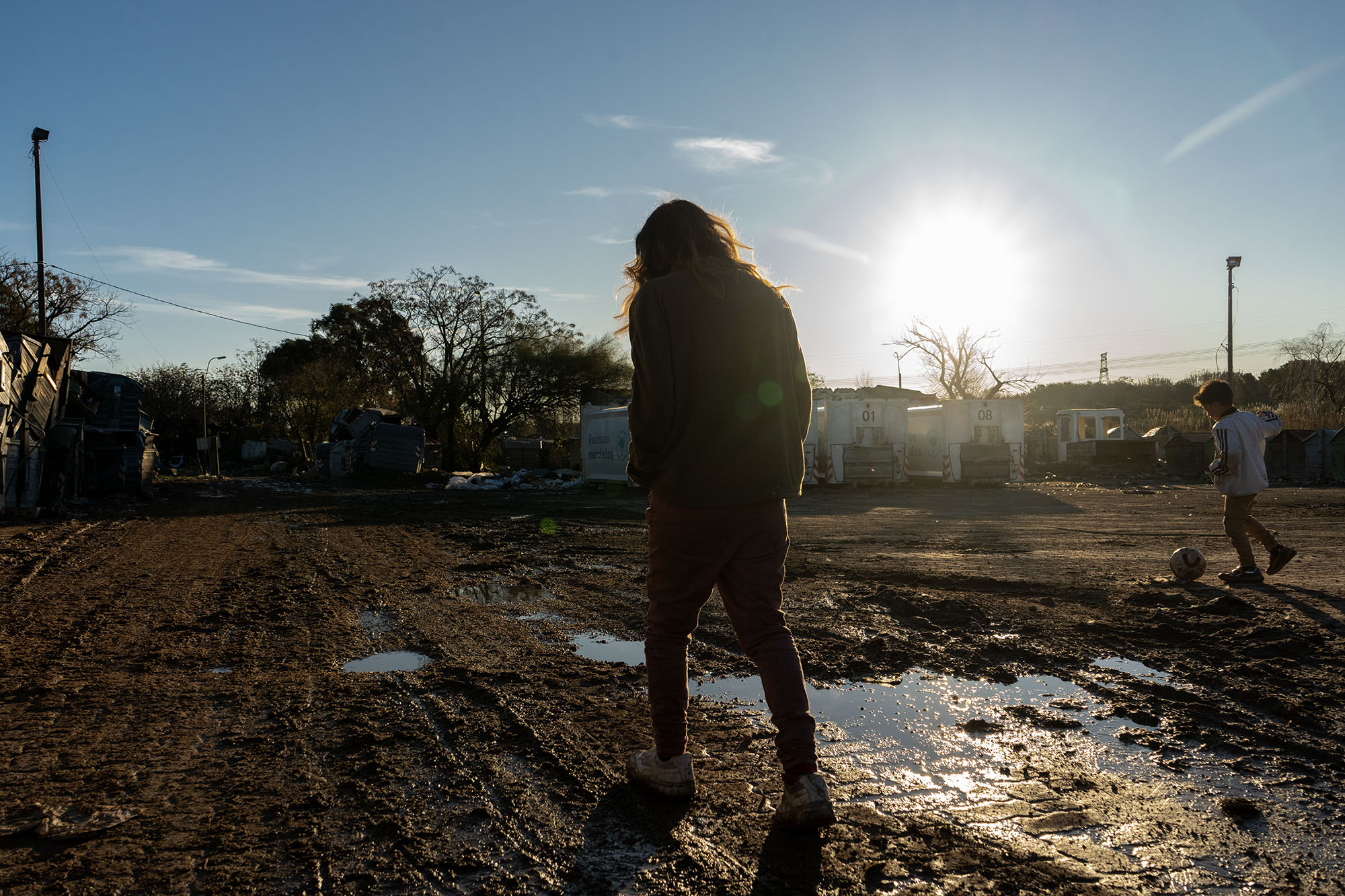 Estela junto a uno de sus hijos, durante una recorrida por las afueras de la usina de Felipe Cardozo, el 4 de setiembre.