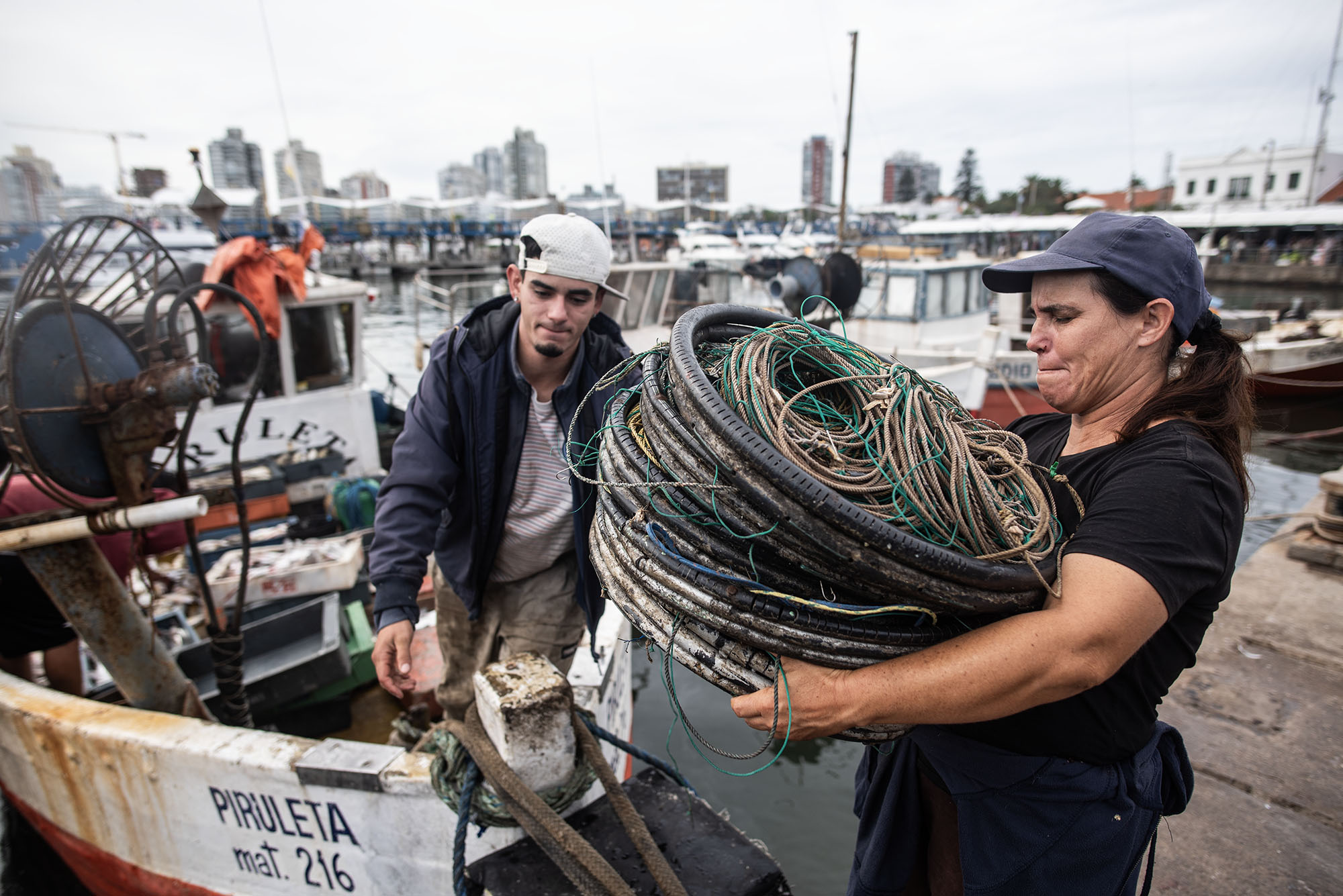 Una alistadora descarga los palangres a la llegada de una embarcación.