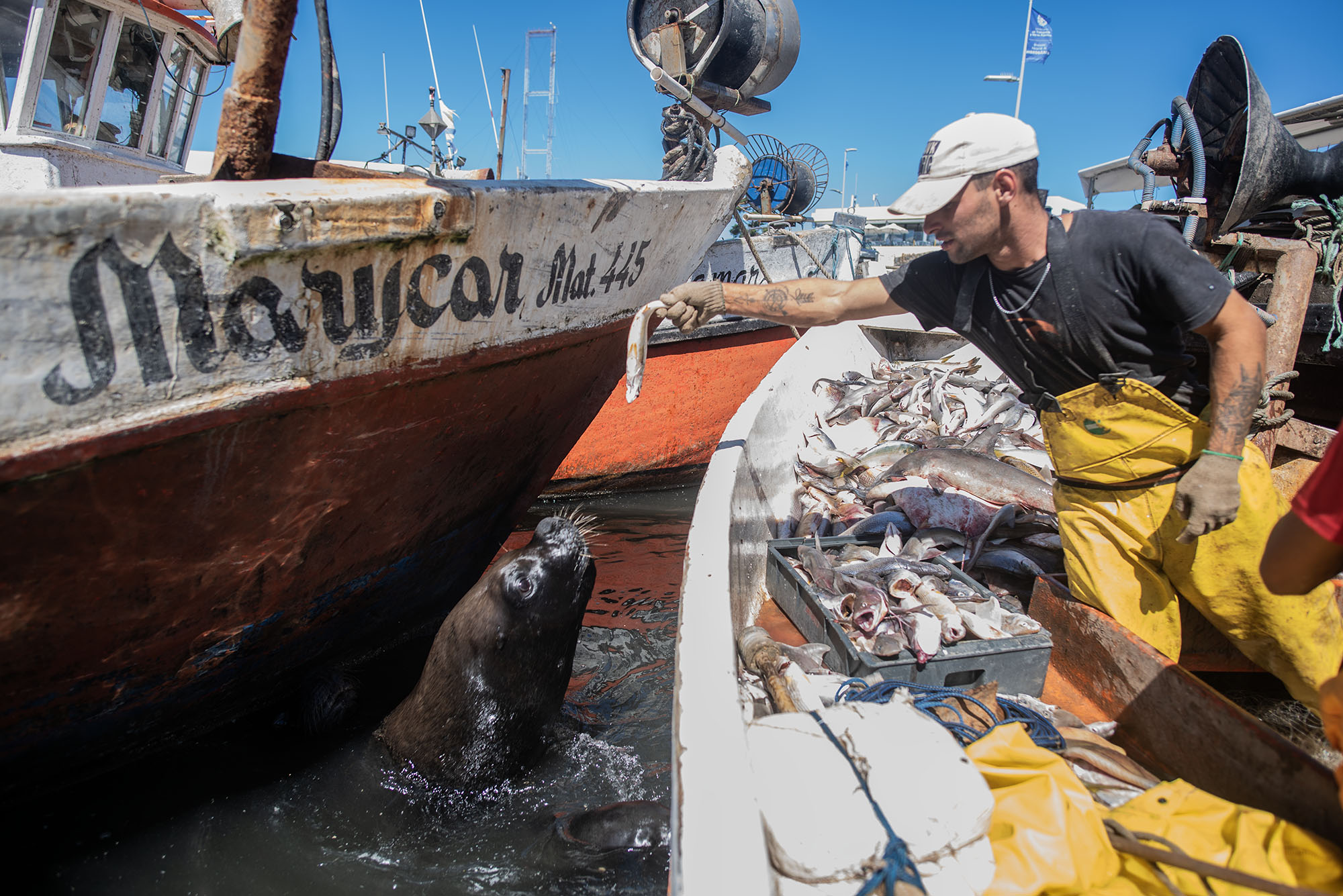 Un pescador alimenta a un lobo marino tras el arribo de su embarcación.