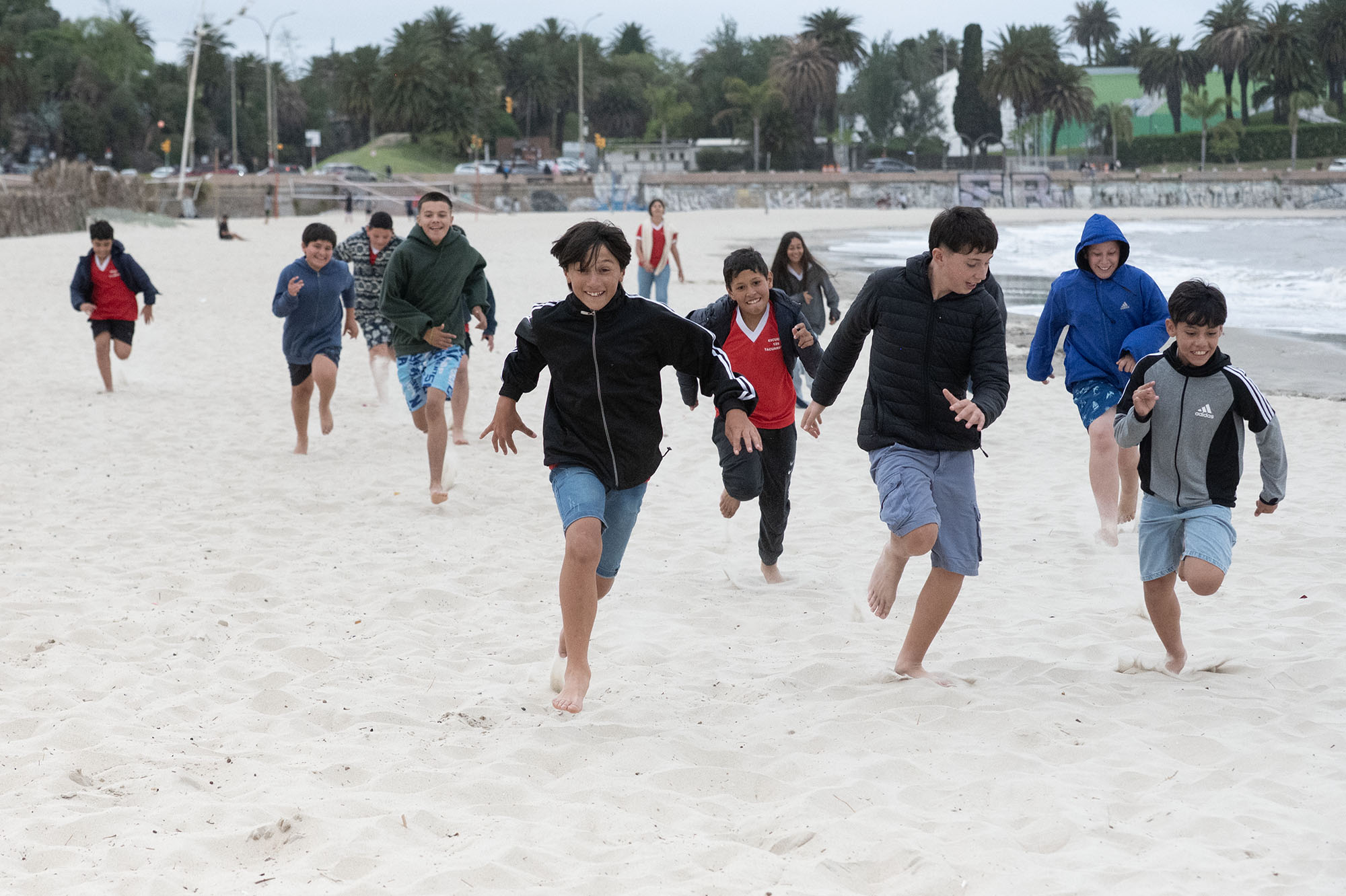 Niños de la Escuela 129 de Tacuarembó en la playa Ramírez, Montevideo.