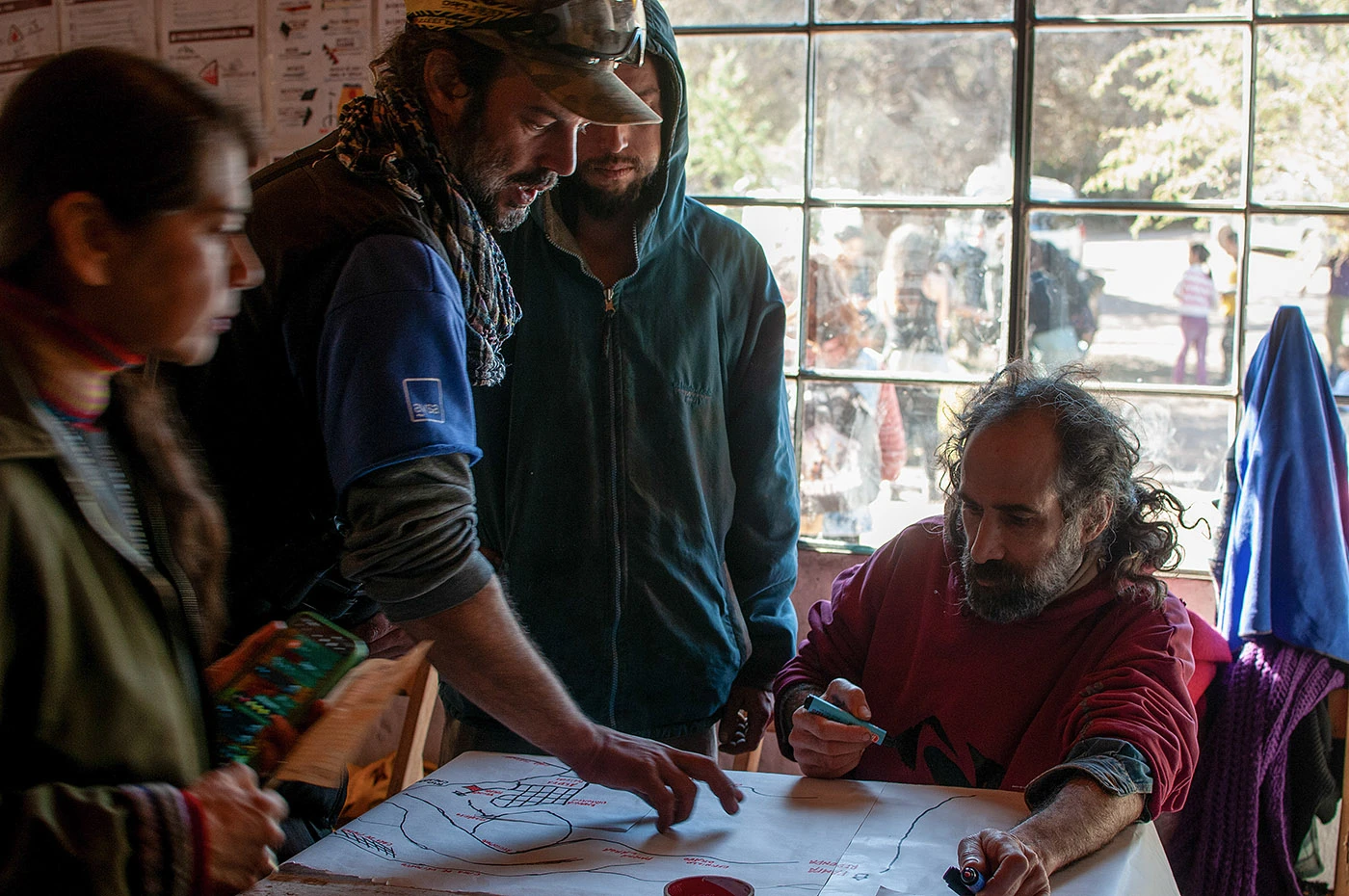 Un grupo de conocedores de las sierras dibuja el mapa de las zonas donde no hay caminos.