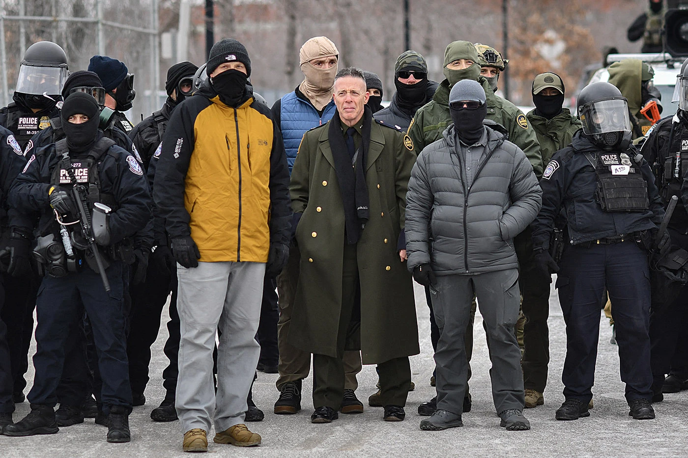 El comandante general del ICE, Gregory Bovino (en el centro), flanqueado por agentes federales durante una protesta contra el ICE frente al edificio federal Bishop Whipple, el 15 de enero.