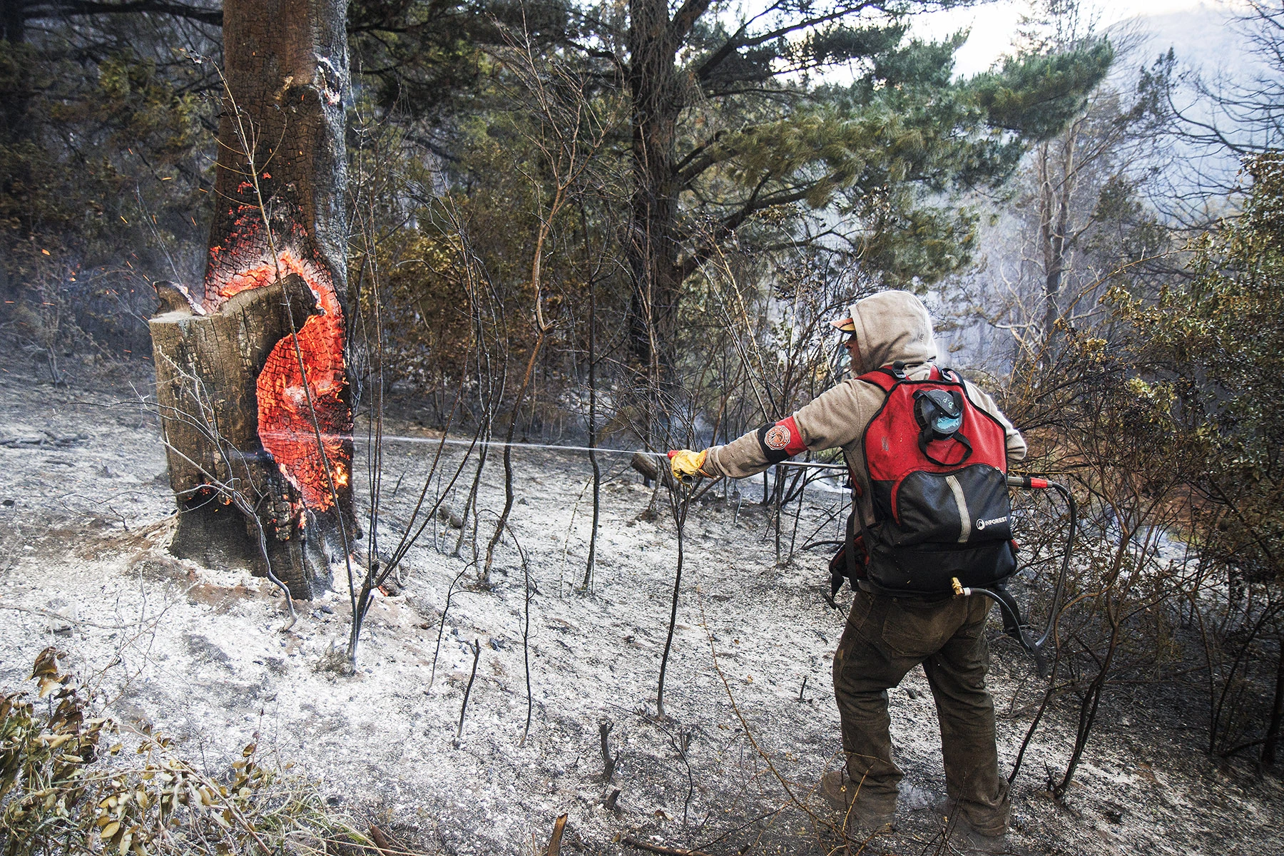 En las zonas donde no acceden vehículos se combate el fuego con mochilas.