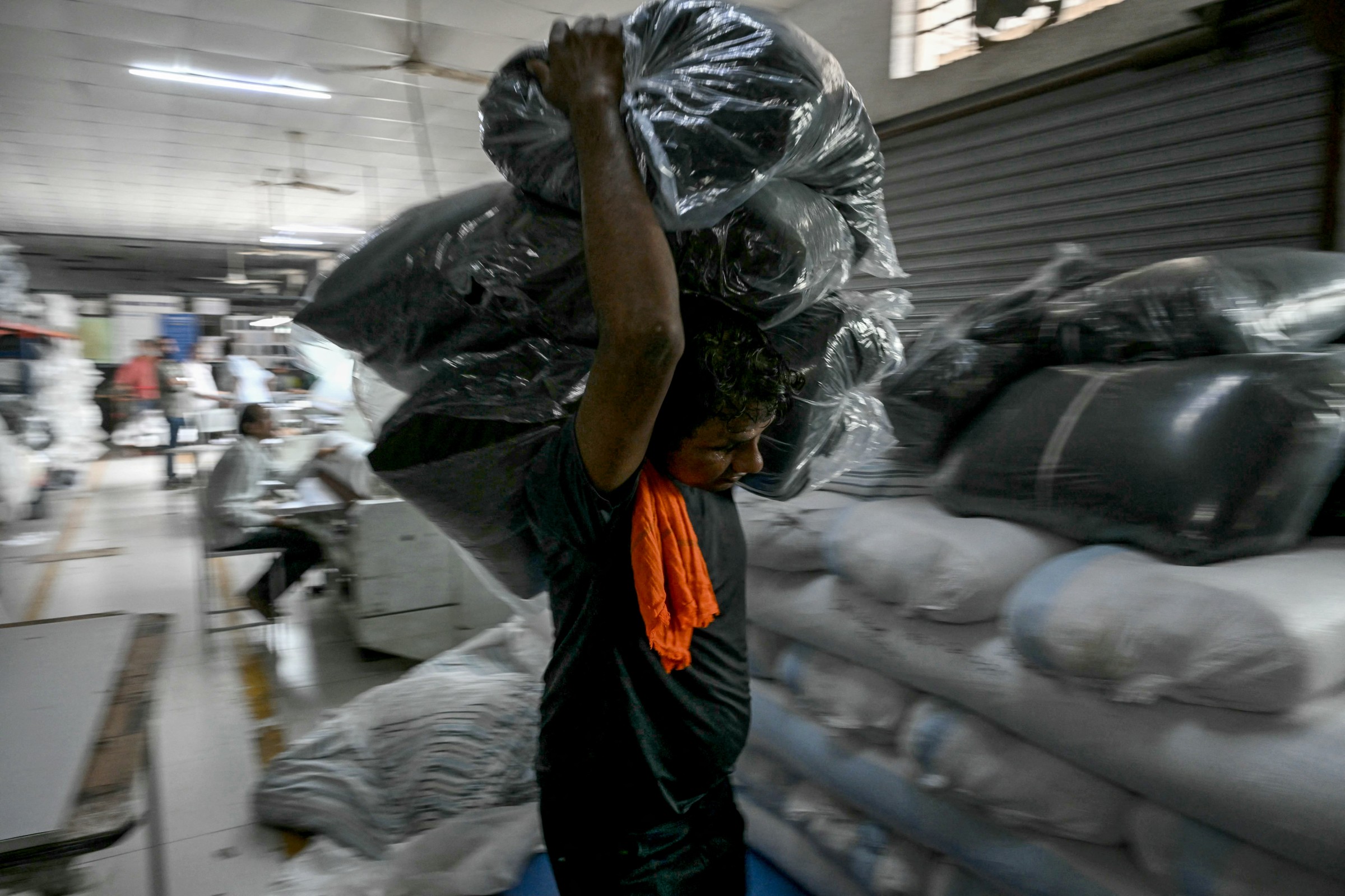 Un trabajador transporta fardos de tela para confección en la unidad de fabricación de prendas de vestir de Bhiwandi, en el distrito de Thane, estado indio de Maharashtra, el 30 de julio.