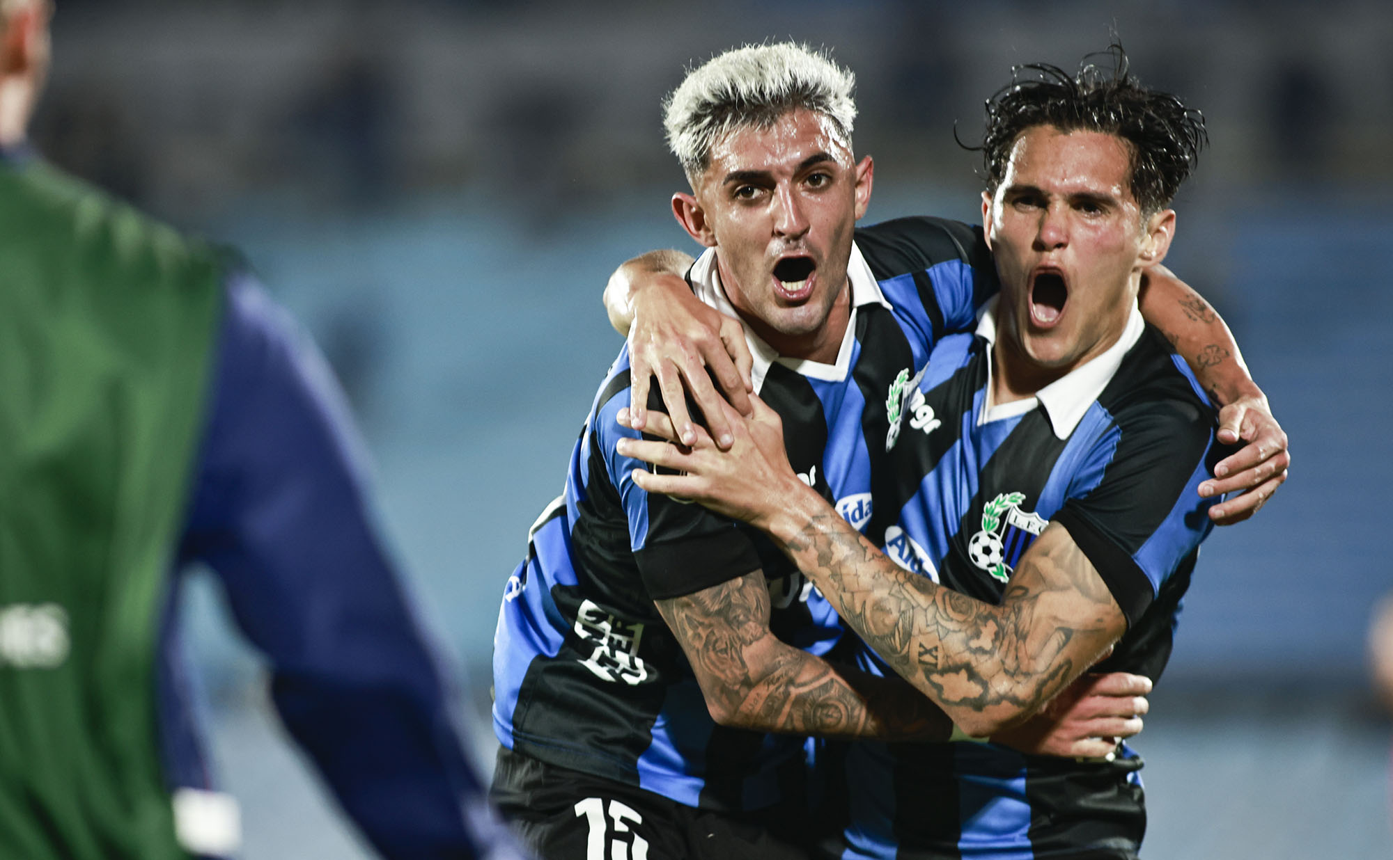 Gastón Martirena y Ruben Bentancourt, de Liverpool, tras el gol a Independiente del Valle, en el estadio Centenario (24.05.2023).