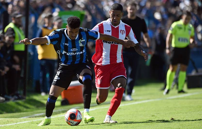 Kevin Amaro, de Liverpool, y Juan Cruz de los Santos, de River Plate, el 6 de abril, en Belvedere.