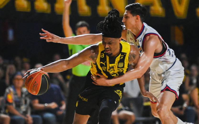 Shaquille Johonson, de Peñarol, y Franco Giorgetti, de Nacional, ayer, en el Palacio Peñarol.