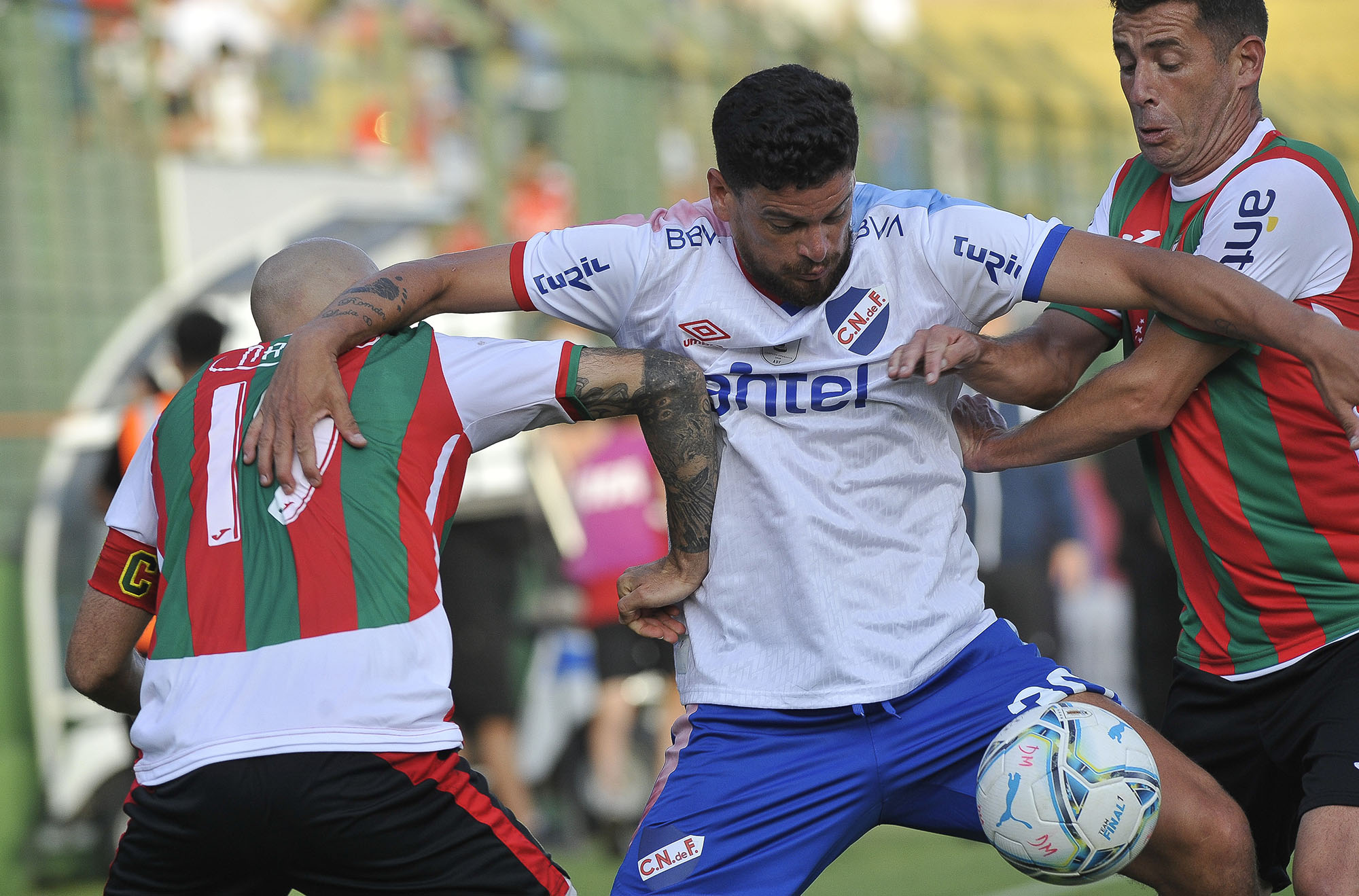 Maximiliano Cantera (c), de Nacional, y Facundo Tealde y Mariano Bogliacino, de Deportivo Maldonado, este 13 de noviembre, en el estadio Domingo Burgueño.