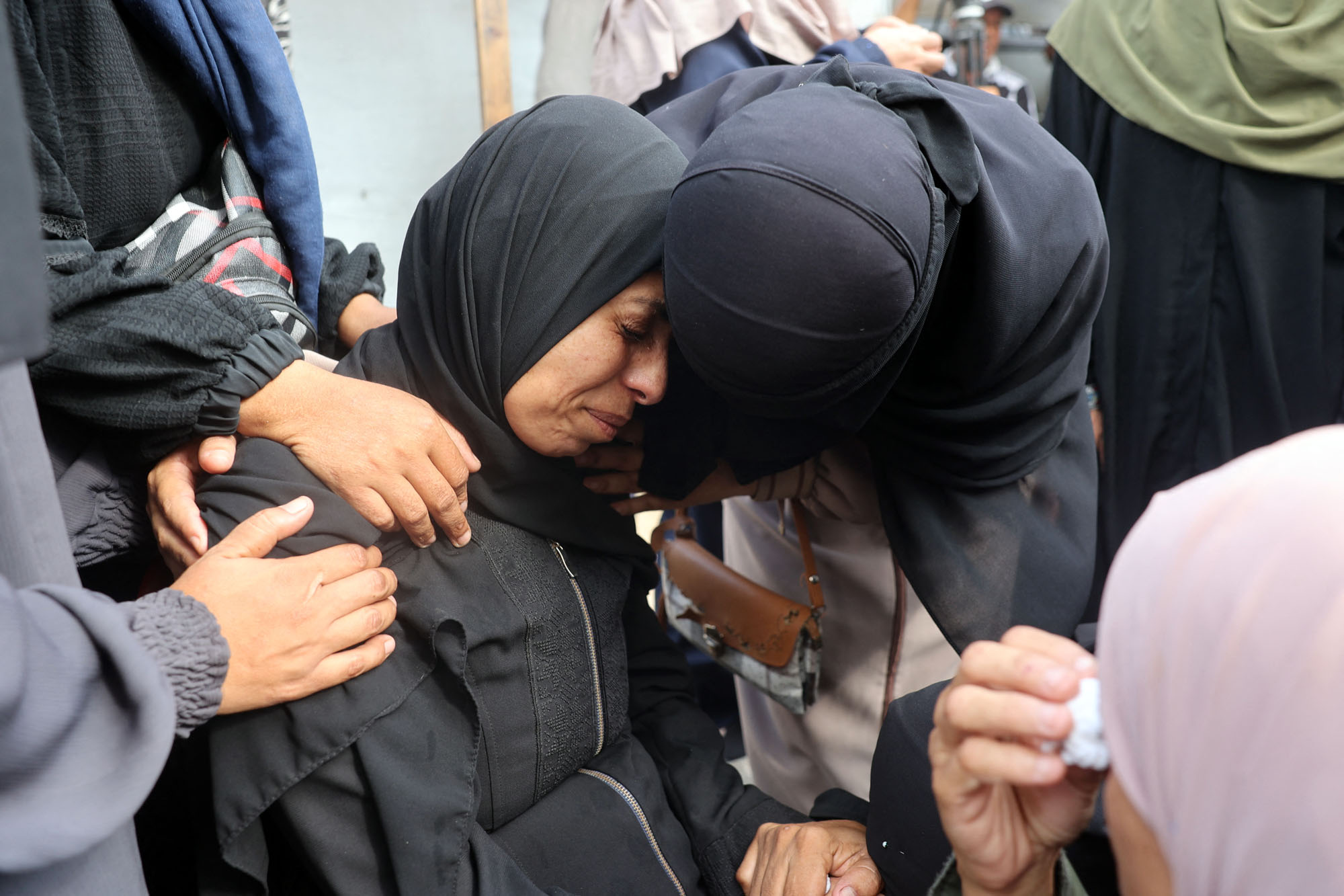 Palestinos lloran a sus familiares, muertos en un ataque israelí, en el hospital de los Mártires de Al-Aqsa, el 17 de agosto, en Deir el-Balah, Franja de Gaza.