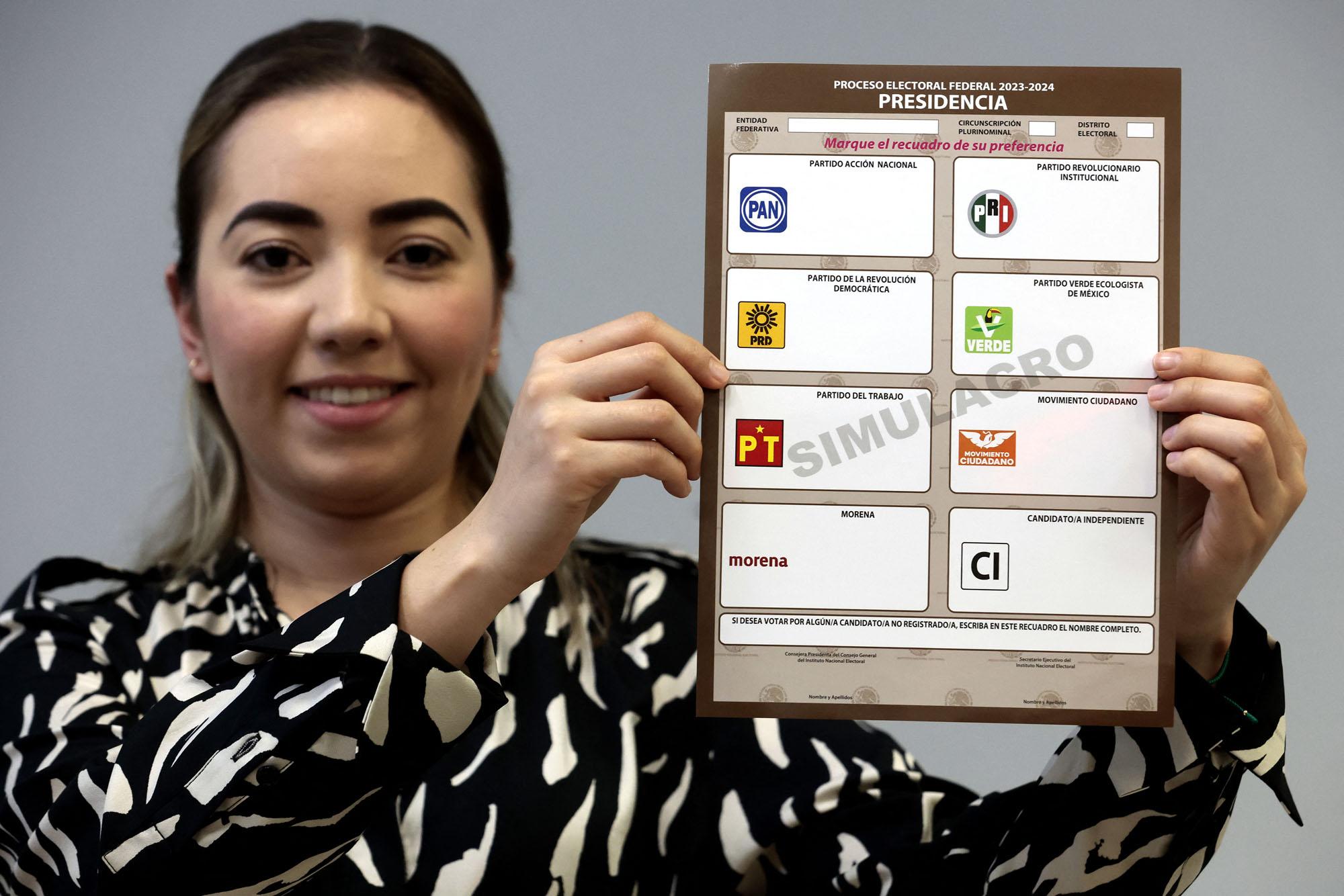Una funcionaria del Instituto Nacional Electoral con la boleta que se utilizará para la elección de presidente en las próximas elecciones del 2 de junio en Guadalajara, Estado de Jalisco, México.
