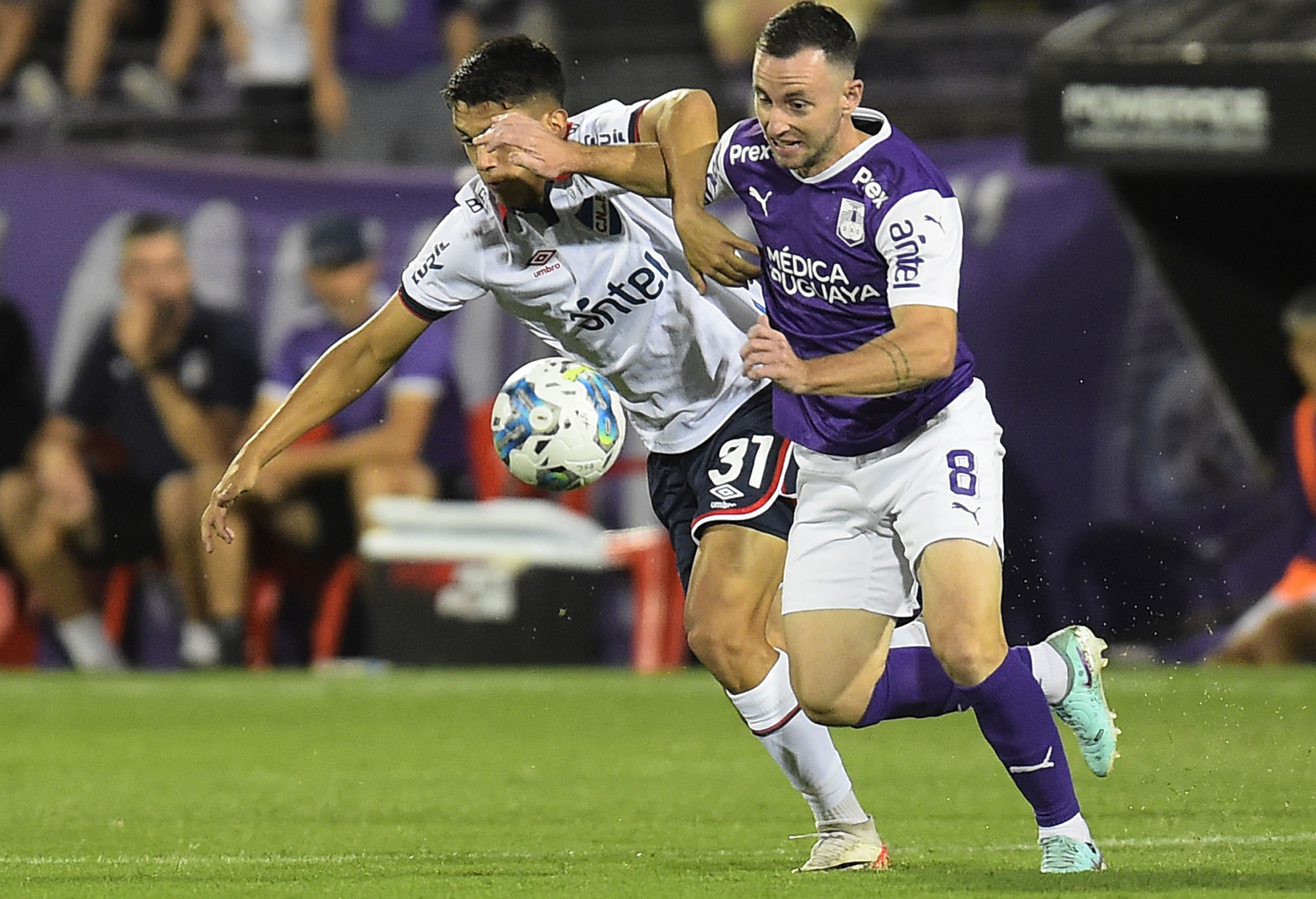 Thiago Helguera, de Nacional, y Fernando Elizari, de Defensor Sporting, el domingo 10 de marzo, en el estadio Luis Franzini.