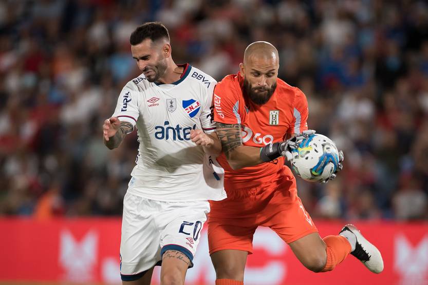 Gastón Pereiro, de Nacional, y Nicolás Gentilio, de Racing, en el Gran Parque Central (26.02.2023).