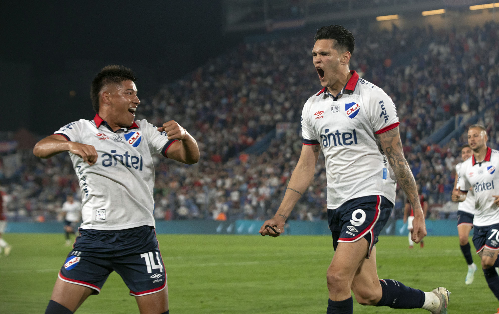 Leandro Lozano y Ruben Bentancourt, de Nacional, tras el tercer gol a Miramar Misiones, el 17 de octubre, en el Gran Parque Central.