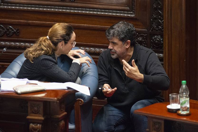Carmen Sanguinetti y Oscar Andrade en la sesión del Senado donde se aprobó la ley sobre negociación colectiva, el 5 de mayo.