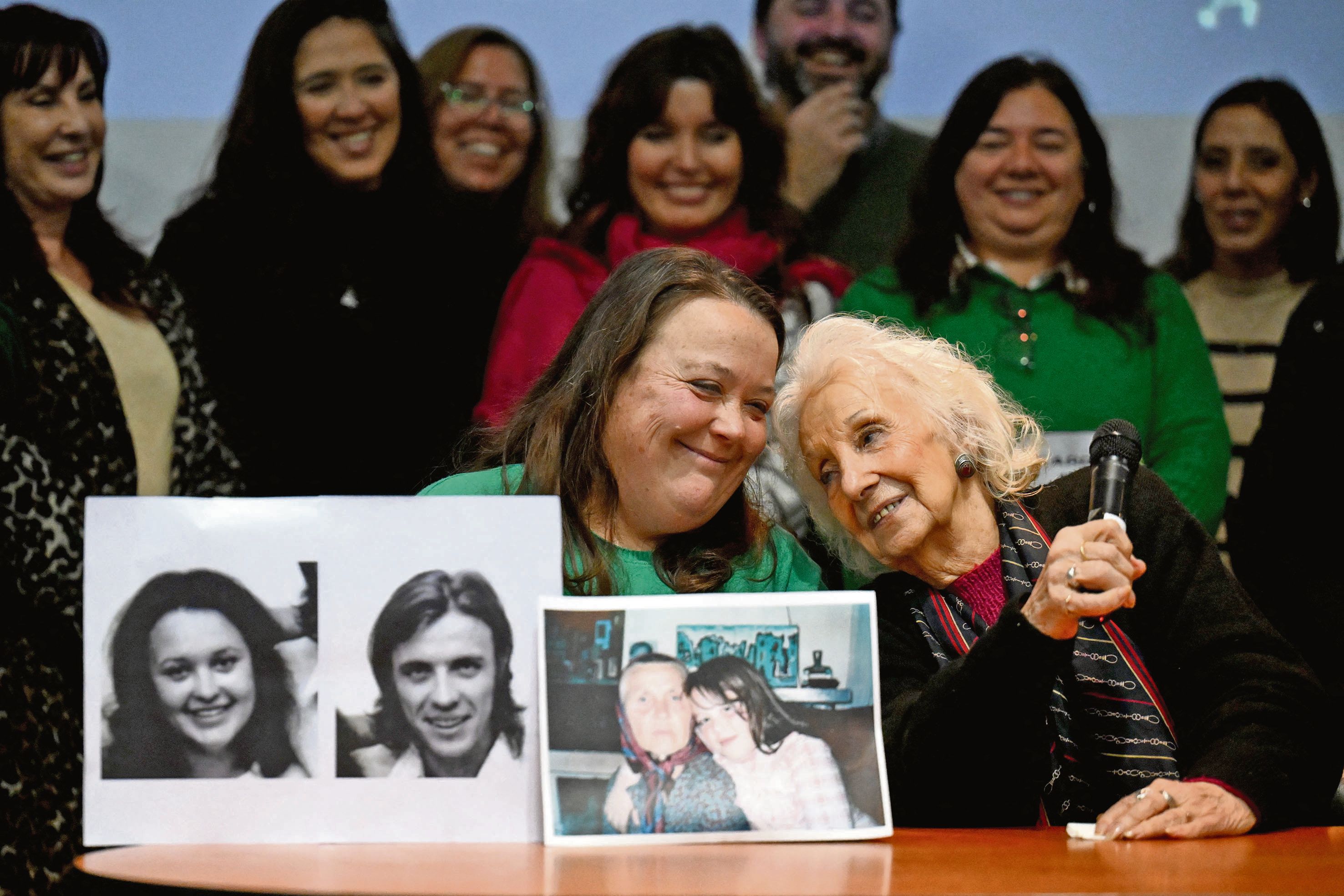 Estela de Carlotto (der.), presidenta de Abuelas de Plaza de Mayo, junto a Adriana Metz Romero (izq.), hermana del nieto 140, durante una conferencia de prensa en la Casa de la Identidad, el 7 de julio, en Buenos Aires.