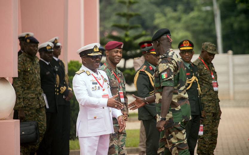 El Jefe del Estado Mayor de Defensa de Ghana, Seth Amoama, da la bienvenida al Jefe del Estado Mayor de Defensa de Senegal, Mbaye Cissé, en Accra, Ghana (17.08.2023).