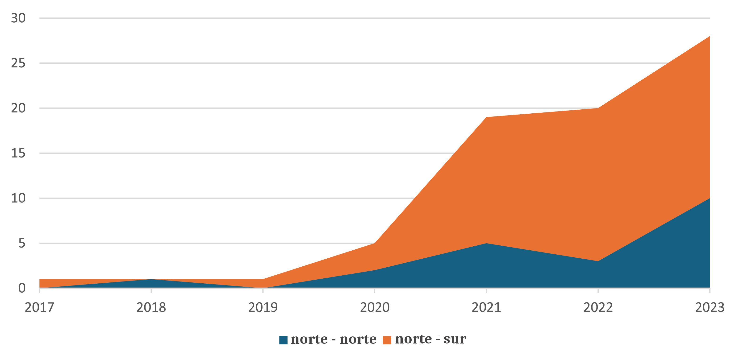 Número acumulado de acuerdos comerciales de hidrógeno por tipo de acuerdo, Dejonghe y Van de Graaf, 2025.