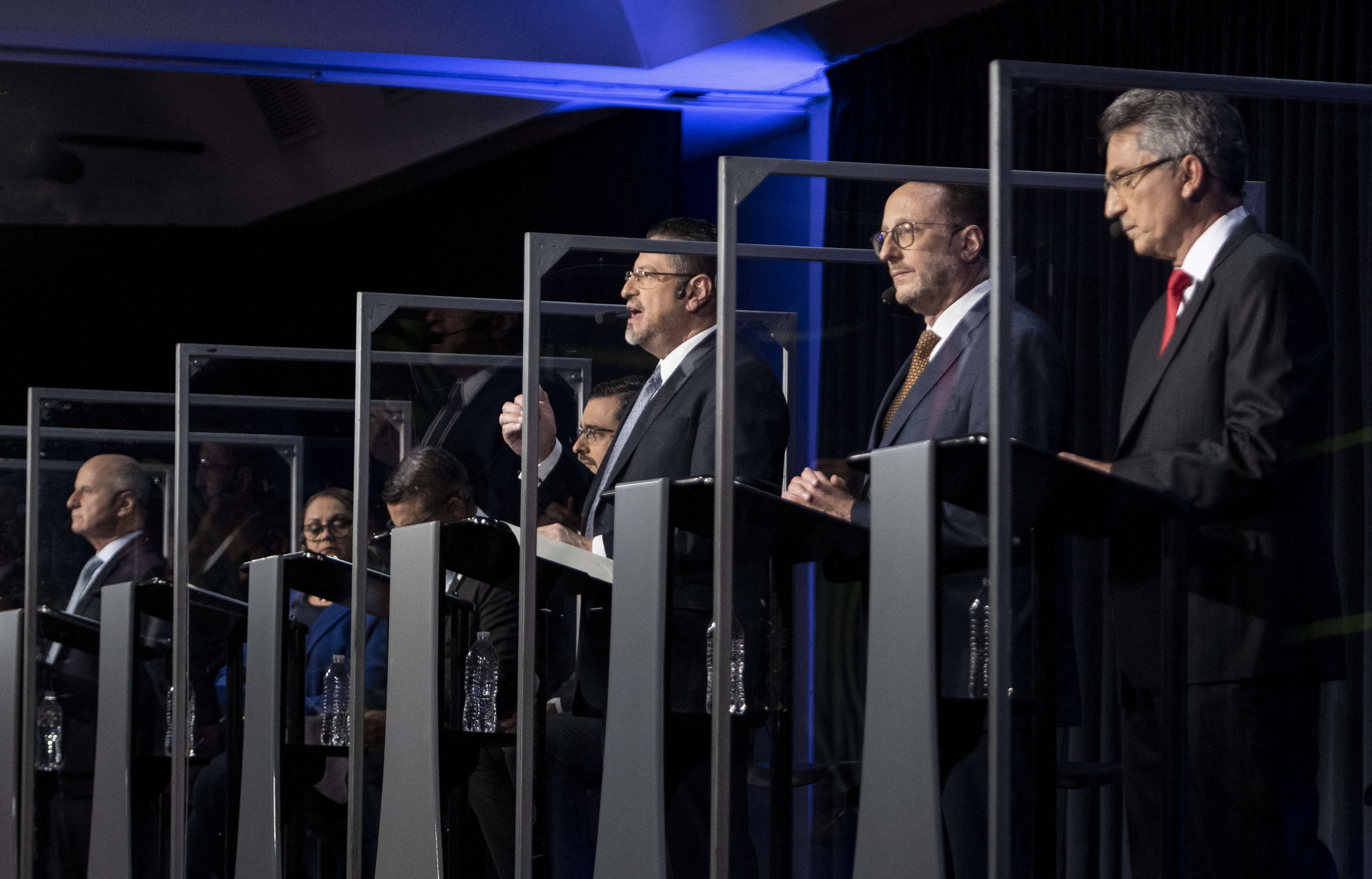 Los precandidatos, José María Figueres, Lineth Saborio, Fabricio Alvarado, José María Villalta, Rodrigo Chaves, Eliécer Feinzaig y Welmer Ramos participan de un debate el 7 de enero en San José.