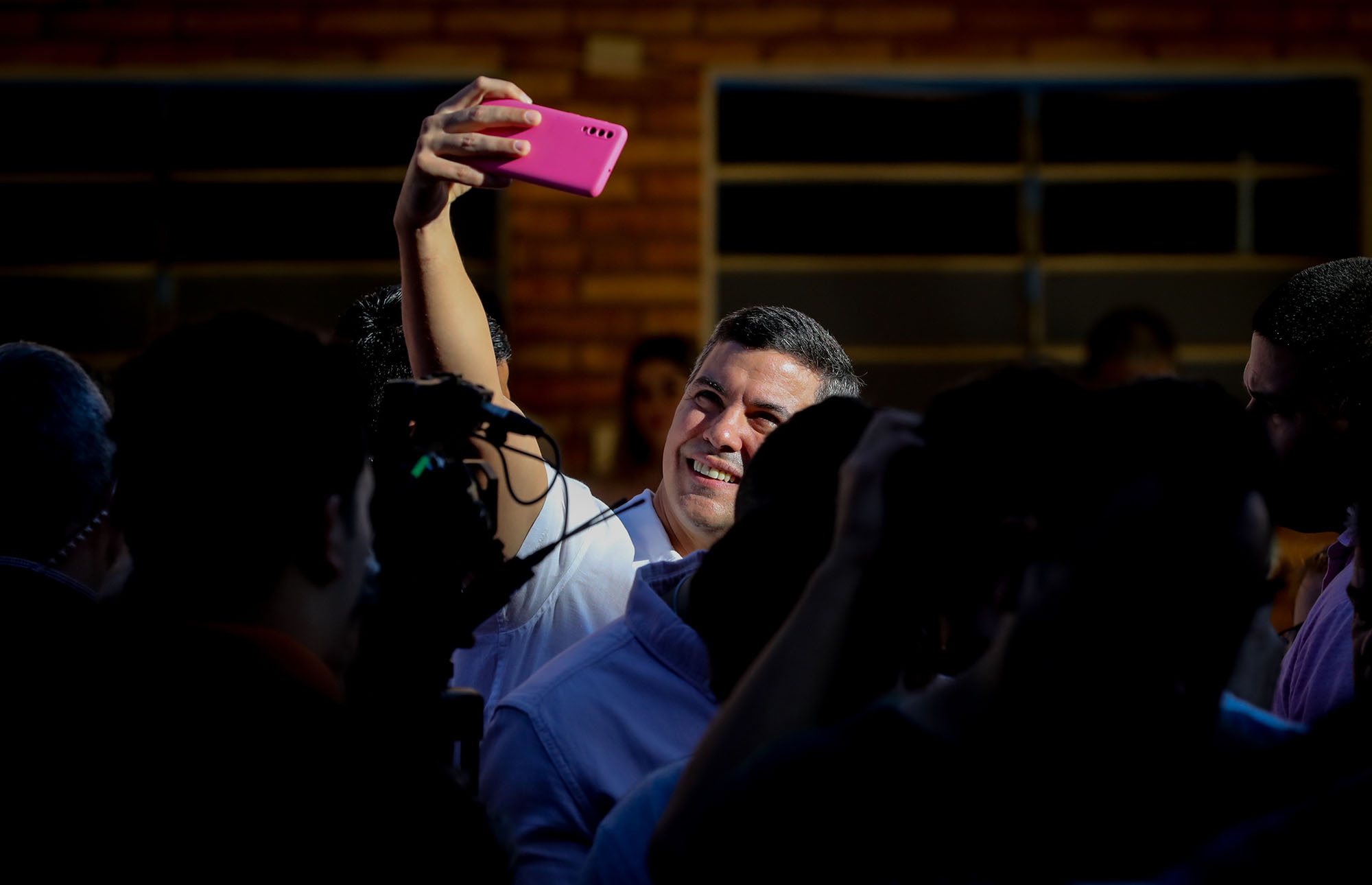 Santiago Peña, candidato por el Partido Colorado, tras votar, este domingo, en la escuela St. Anne's School, en Asunción.