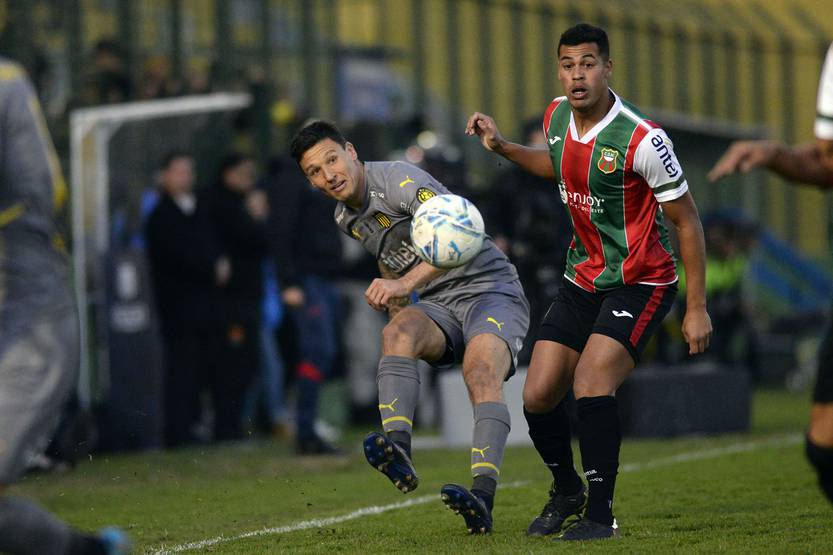Damian Musto, de Peñarol, y Alex Silva, de Deportivo Maldonado, este domingo, en el Campus de Maldonado.