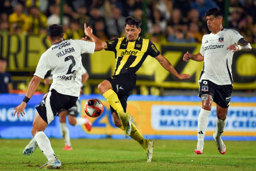 Jonathan Villagra, de Colo Colo, y Maximiliano Silvera, de Peñarol, este domingo, en el Estadio Domingo Burgueño Miguel.