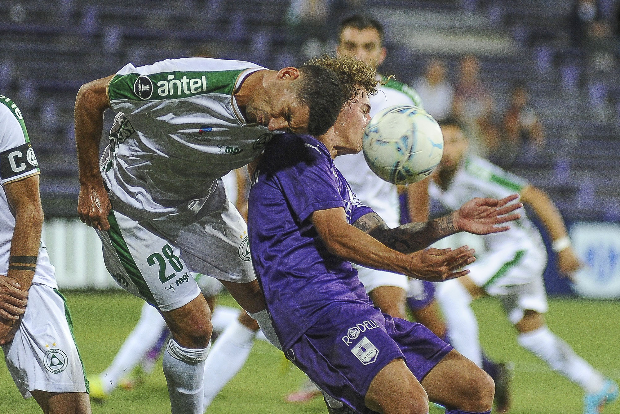 Federico Barrandeguy, de Plaza Colonia, y Luciano Boggio, de Defensor Sporting, el sábado, en el estadio Luis Franzini.
