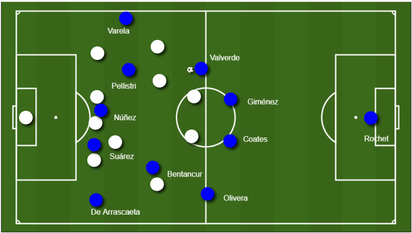 Posicionamiento de Uruguay en el 2-0. Buena amplitud y ocupación de los diferentes carriles.