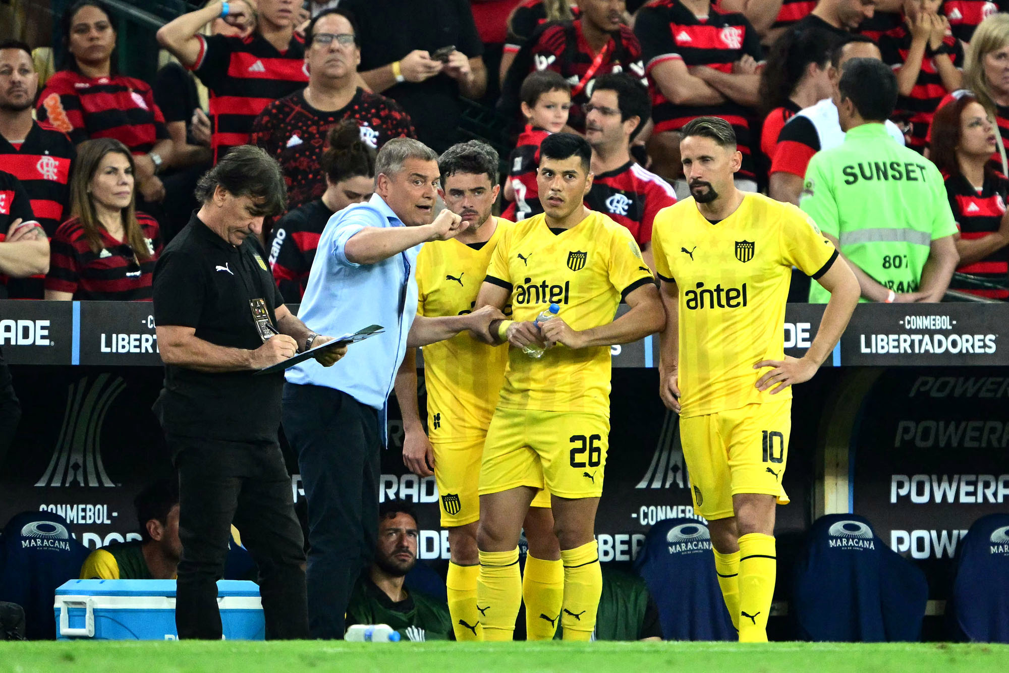El entrenador del Peñarol, Diego Aguirre, habla con Leonardo Sequeira durante el partido de ida de los cuartos de final de la Copa Libertadores entre Flamengo y el Peñarol, el 19 de setiembre, en el estadio Maracaná de Río de Janeiro.