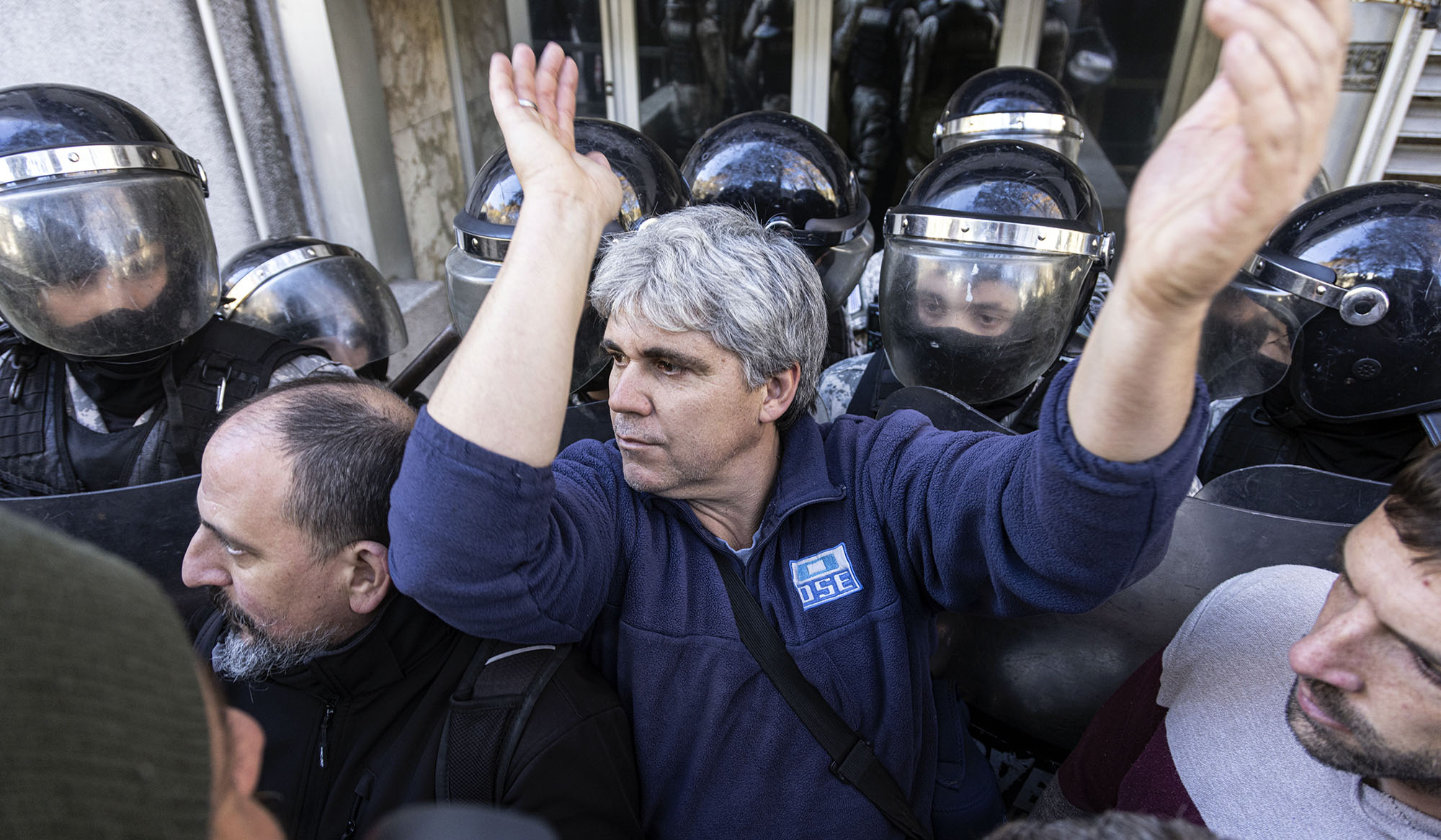 Manifestación de trabajadores sindicalizados de la FFOSE, en la explanada de OSE (13.06.2023).