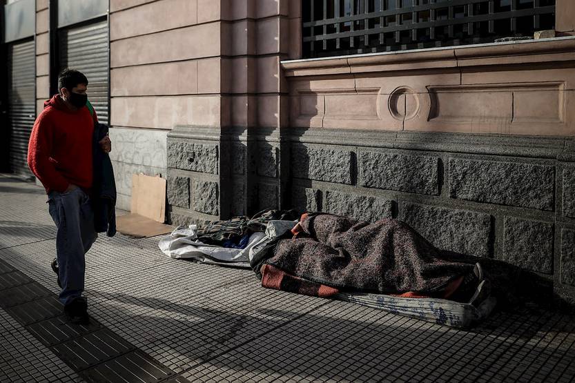 Un hombre camina junto a un grupo de habitantes de calle cerca a la estación ferroviaria de Constitución, Buenos Aires, Argentina.